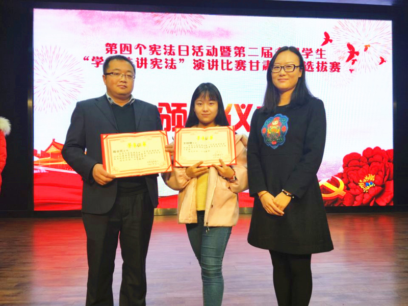 頒獎儀式上,教育部黨組成員、部長助理鄭富芝在主會場網絡視頻直播活動中領讀了憲法部分章節(jié)并講話,甘肅分會場全體成員跟讀了憲法部分章節(jié)。王海燕、劉仲奎分別為第二屆全國學生“學憲法講憲法”演講比賽甘肅省級選拔賽獲獎選手和指導教師頒獎。