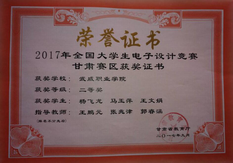 近日,2017年全國大學生電子設計競賽甘肅賽區(qū)成績揭曉。由電子信息工程系2016級應用電子技術專業(yè)楊飛龍、馬玉萍、王文娟3名同學組成的團隊在我系王鵬元、張兆津、郭睿涵3名教師指導下榮獲甘肅賽區(qū)二等獎。此次獲獎也是我系在優(yōu)質校建設中狠抓教學科研和學生技能培養(yǎng)方面取得的豐碩成果。