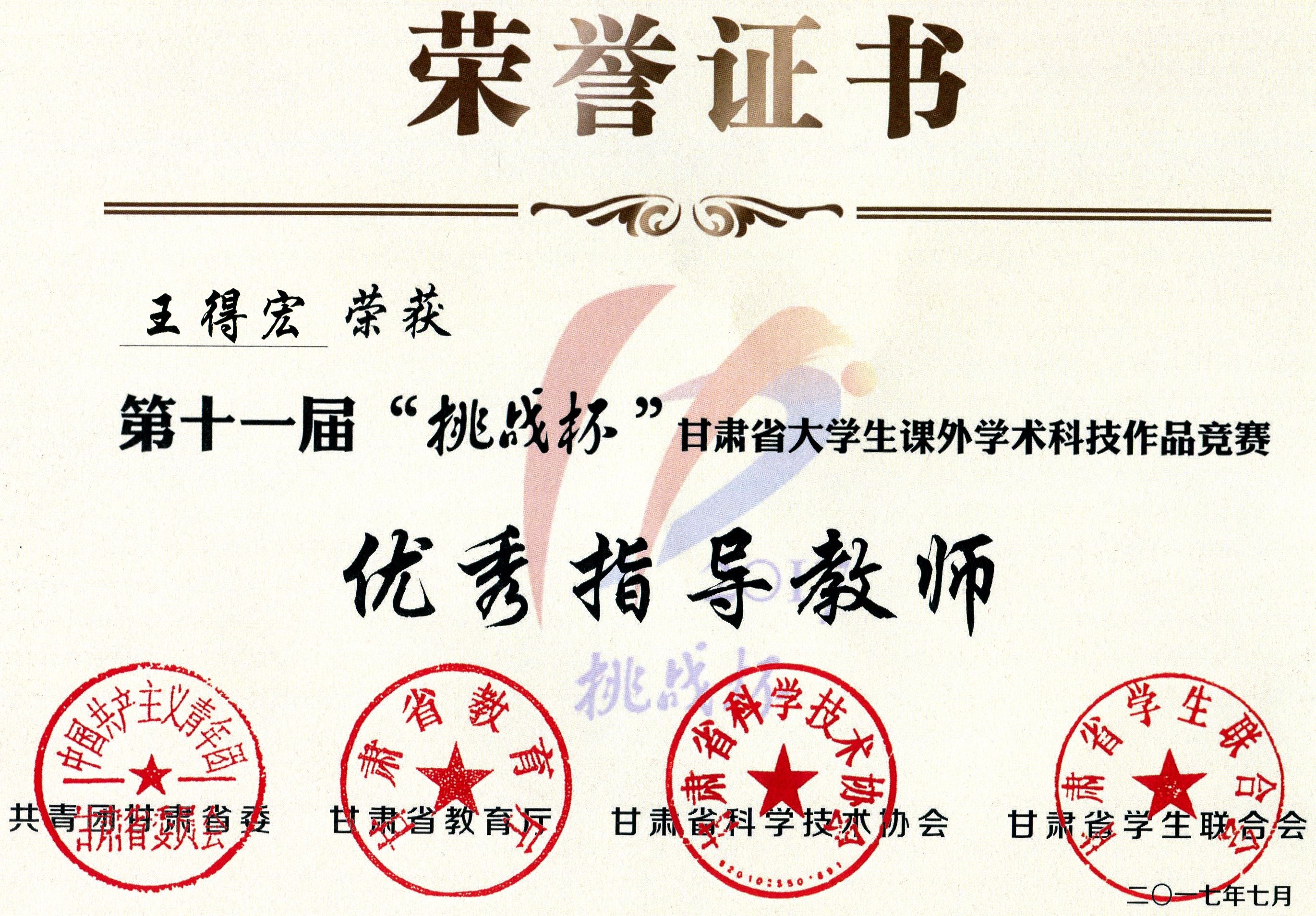 第十一屆“挑戰(zhàn)杯”甘肅省大學(xué)生課外學(xué)術(shù)科技作品競賽“優(yōu)秀指導(dǎo)教師”
