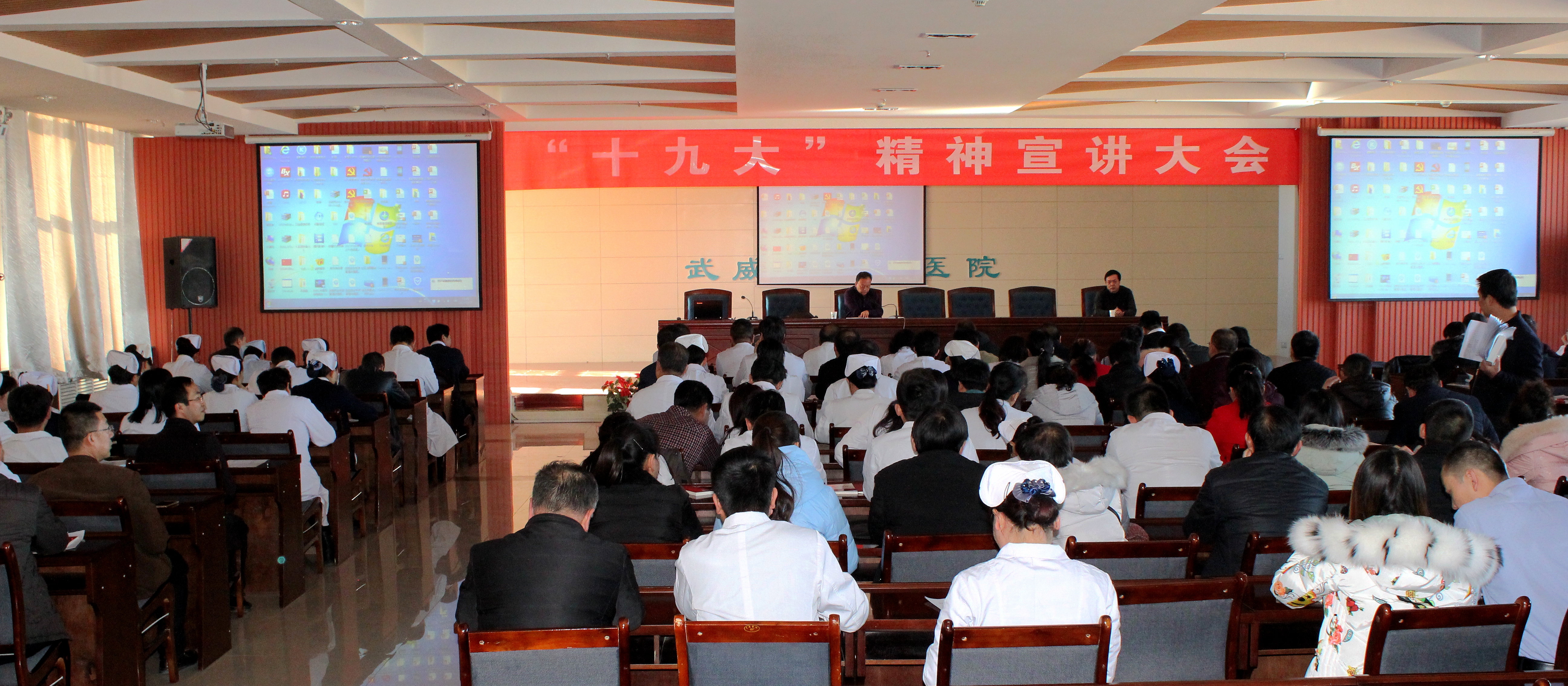 12月27日,直屬附屬醫(yī)院在內(nèi)科七樓舉行黨的十九大精神宣講報(bào)告大會(huì)。會(huì)議邀請(qǐng)武威市委講師團(tuán)副團(tuán)長(zhǎng)張生龍作宣講報(bào)告。直屬附屬醫(yī)院黨委書(shū)記陳鋼主持報(bào)告會(huì)。醫(yī)院全體共產(chǎn)黨員、中層以上干部160余人聆聽(tīng)了宣講報(bào)告。