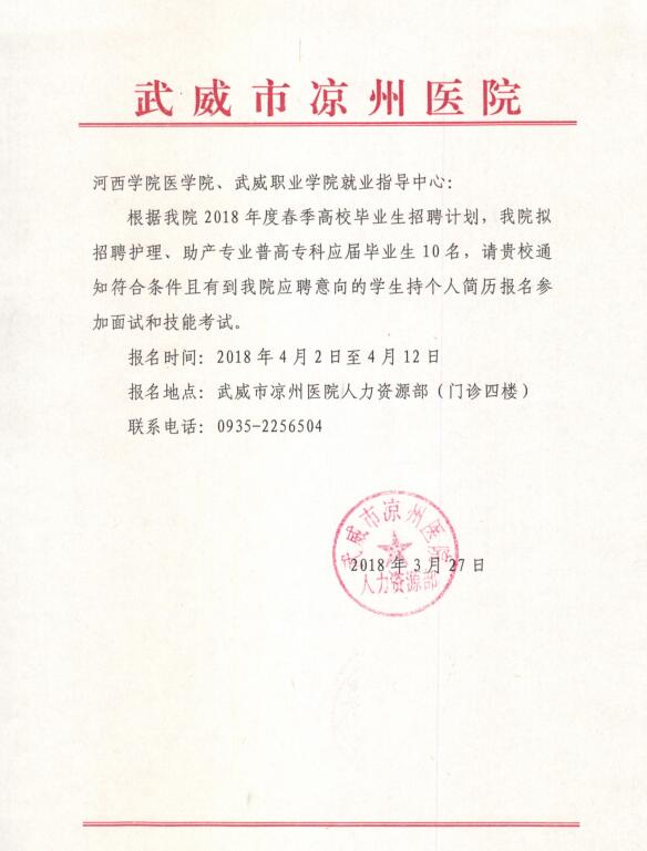 ? ? ? ?武威市涼州醫(yī)院擬招聘護(hù)理、助產(chǎn)專業(yè)畢業(yè)生10名,報(bào)名時(shí)間2018年4月2日~4月12日,報(bào)名時(shí)請(qǐng)攜帶個(gè)人簡(jiǎn)歷,一寸彩色照片一張,請(qǐng)我系15級(jí)應(yīng)屆畢業(yè)生積極響應(yīng),踴躍報(bào)名!