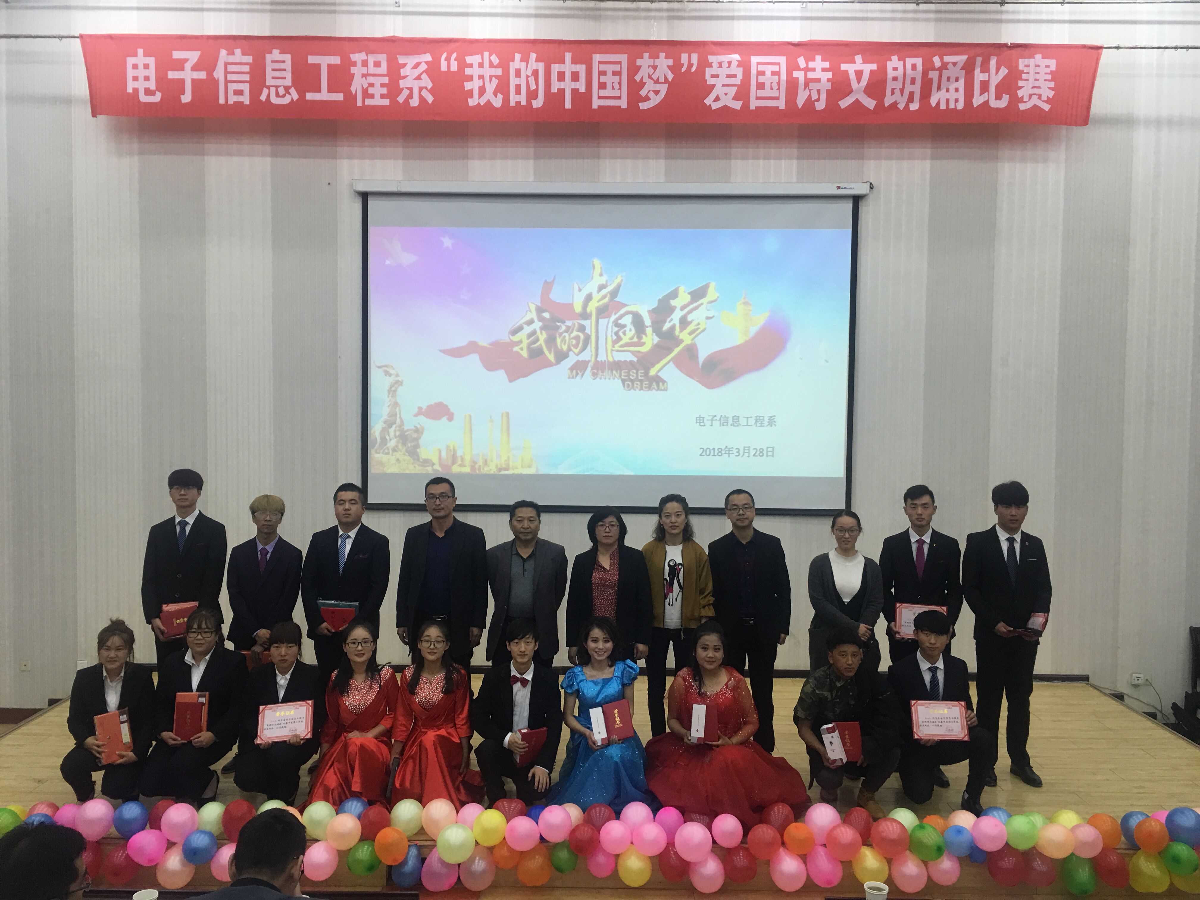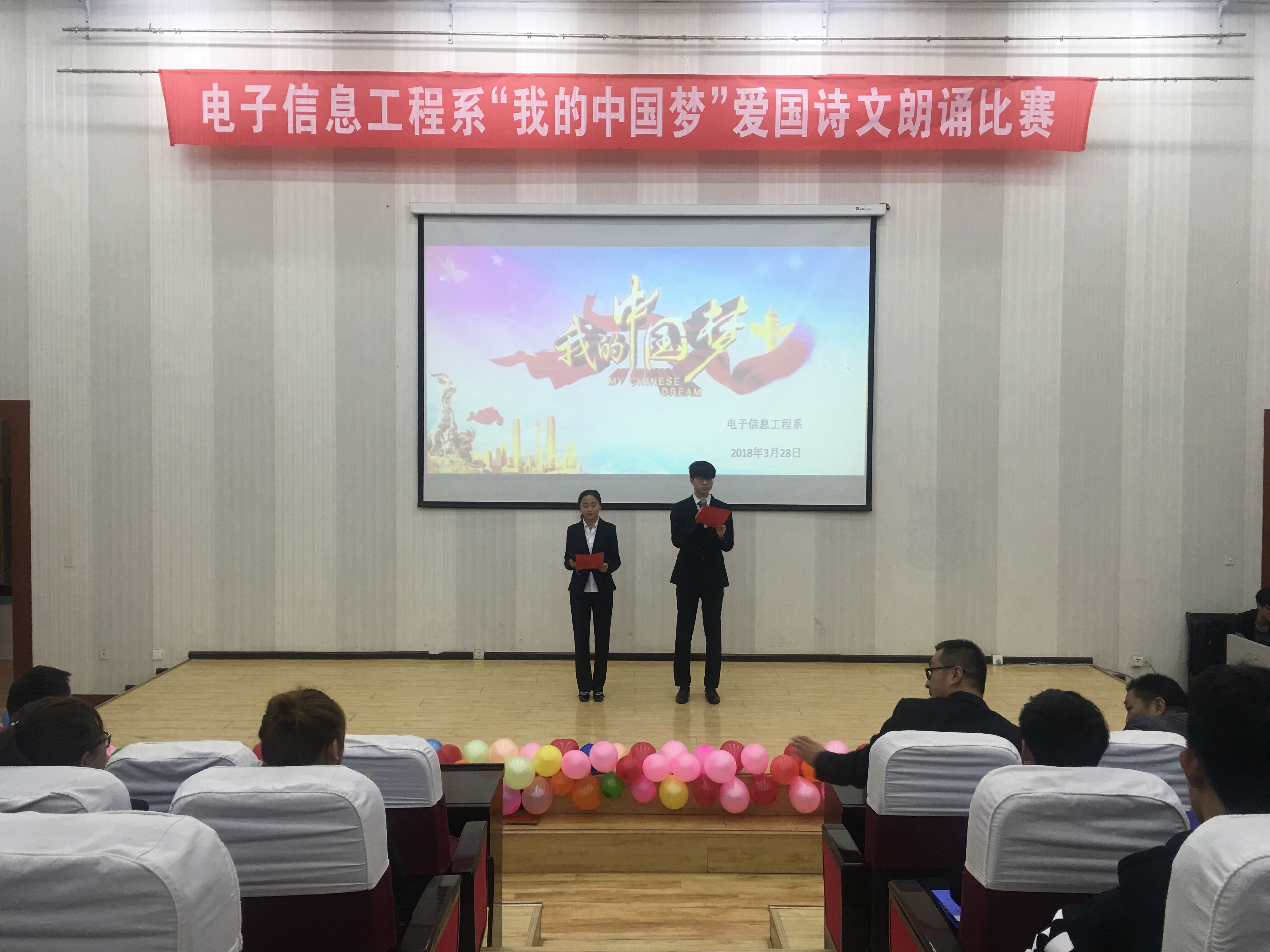 為進(jìn)一步弘揚和培育社會主義核心價值觀,引導(dǎo)學(xué)生實現(xiàn)國家富強、民族復(fù)興的偉大“中國夢”而發(fā)憤圖強、勇?lián)厝危?/span>激勵學(xué)生通過誦讀經(jīng)典來繼承傳統(tǒng),增強學(xué)生的愛國情感。3月28日,電子信息工程系在正德廳舉辦了“我的中國夢”愛國詩文朗誦比賽。電子信息工程系黨總支書記袁青年、系主任李亞梅、全體班主任及學(xué)生觀看了比賽。