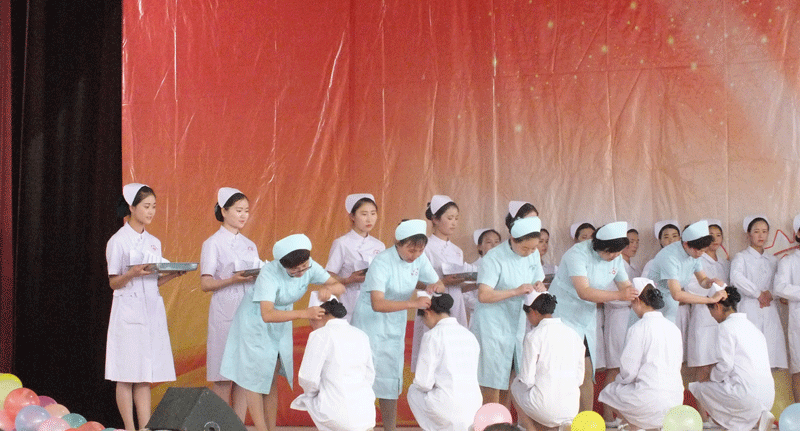 在慶祝活動(dòng)中,2015級(jí)畢業(yè)生代表進(jìn)行“心肺復(fù)蘇技術(shù)”及“右踝關(guān)節(jié)扭傷包扎技術(shù)”表演, 舉行了文藝演出,向全體觀(guān)眾展示了護(hù)理系學(xué)生的精神風(fēng)貌與才藝。