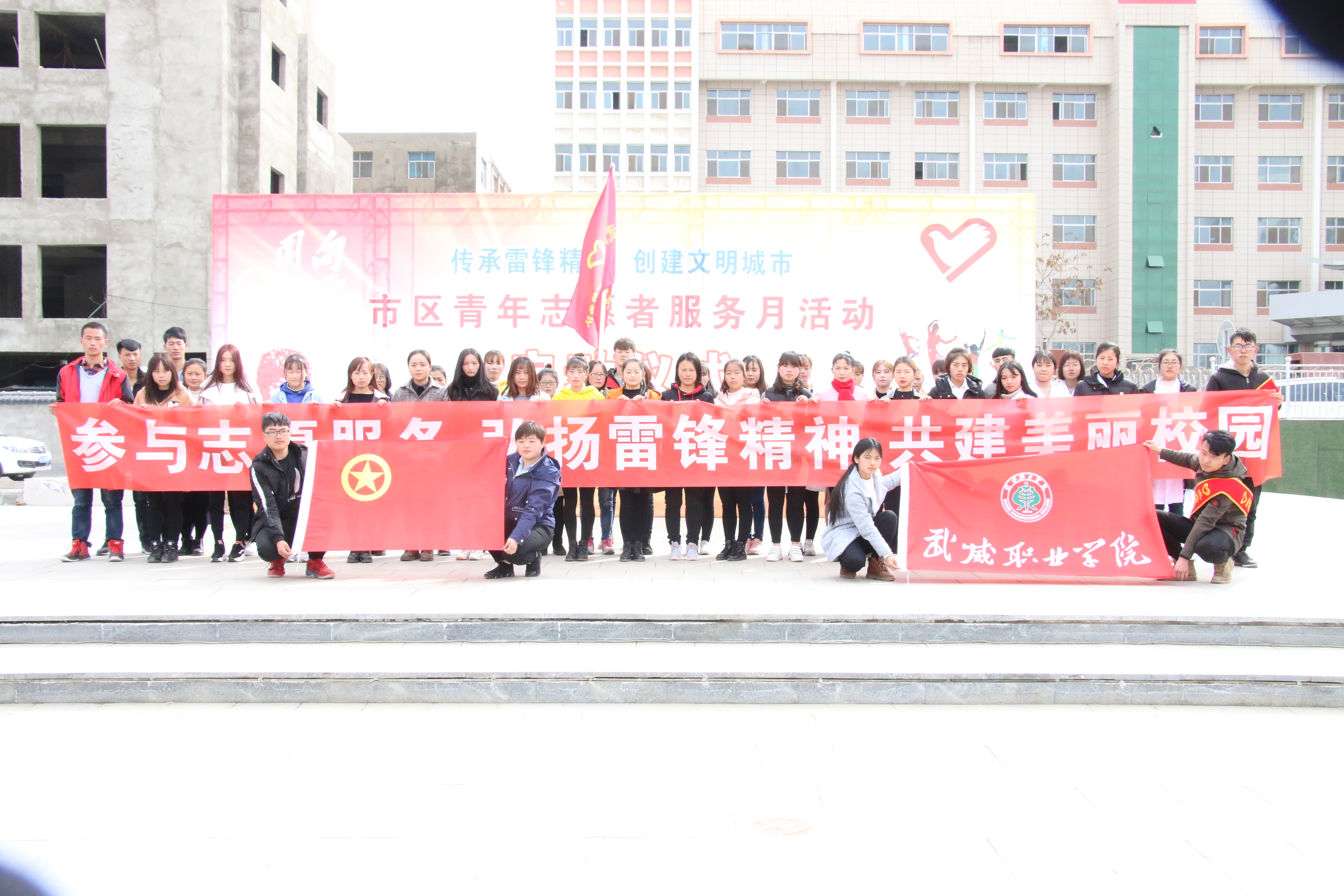 今年是毛澤東等老一輩革命家為雷鋒同志題詞55周年,3月5日是中國青年志愿者服務(wù)日。 3月5日下午,學(xué)院50名志愿者在武威市文化廣場參加了全市志愿者服務(wù)月活動(dòng)啟動(dòng)儀式,活動(dòng)現(xiàn)場氣氛熱烈,市領(lǐng)導(dǎo)為我院志愿服務(wù)隊(duì)進(jìn)行了授旗,青年志愿者代表宣讀了倡議書,全體志愿者重溫了青年志愿者誓詞。