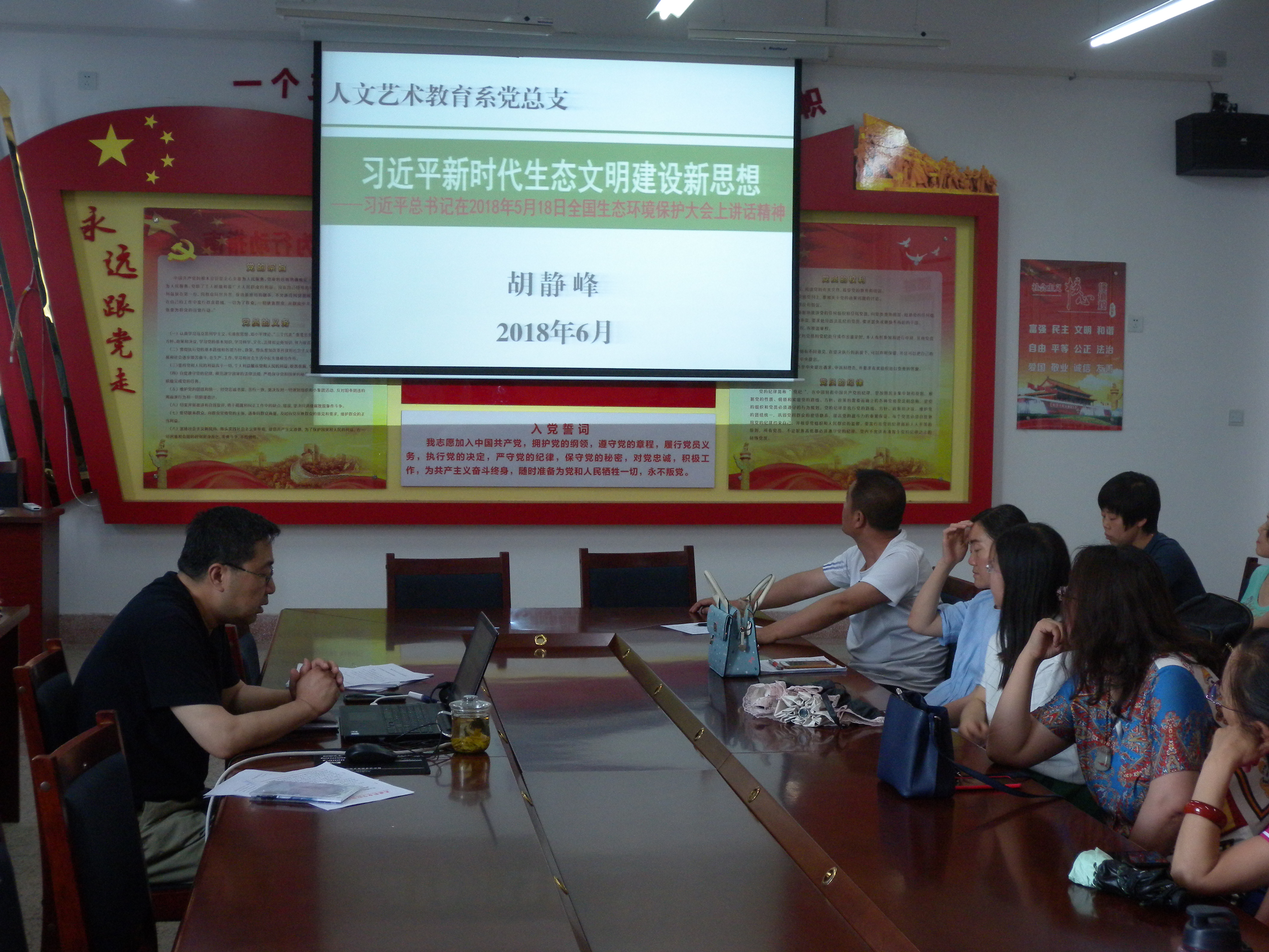 為深入學(xué)習(xí)習(xí)近平新時(shí)代中國(guó)特色社會(huì)主義思想,人文藝術(shù)教育系黨總支于6月13日下午在勵(lì)勤樓209黨員活動(dòng)室開展書記講黨課活動(dòng)。黨課由系黨總支書記胡靜峰主講,題目為《習(xí)近平新時(shí)代生態(tài)文明建設(shè)新思想》,系全體黨員參加了此次活動(dòng)。