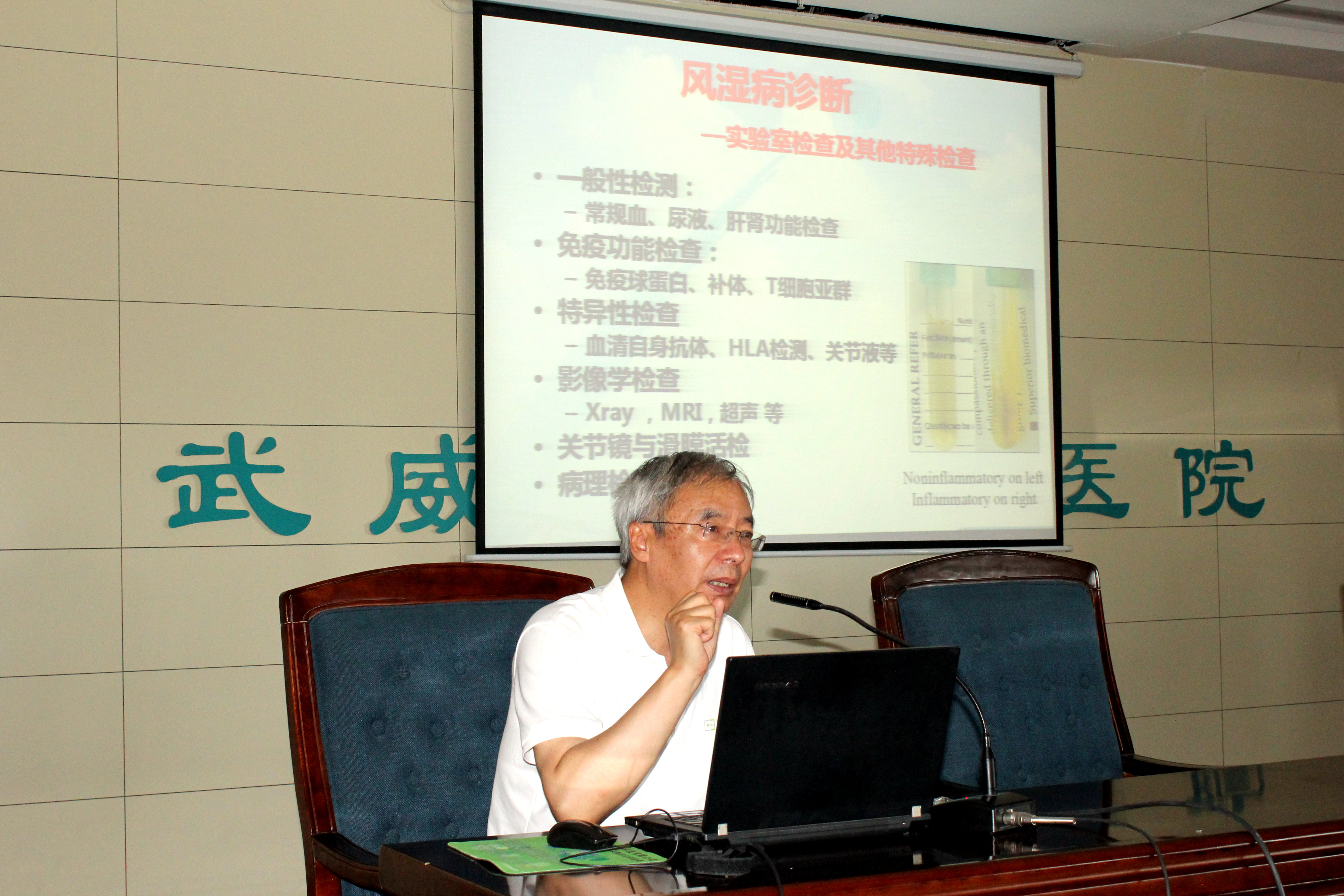 為提高醫(yī)務(wù)人員診治風(fēng)濕病的技術(shù)水平,學(xué)院直屬附屬醫(yī)院于6月29日下午,在內(nèi)科七樓會(huì)議室舉辦風(fēng)濕病診治學(xué)術(shù)報(bào)告會(huì)。醫(yī)院邀請(qǐng)?zhí)m大二院著名風(fēng)濕病專家王軼作“風(fēng)濕免疫實(shí)驗(yàn)室檢查”為題的學(xué)術(shù)報(bào)告,副院長張仁德主持會(huì)議,醫(yī)院各科室百余名醫(yī)療骨干參加學(xué)術(shù)會(huì)議聆聽報(bào)告。