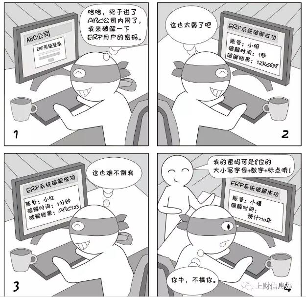 密碼越復(fù)雜,破解難度越高,而且這個(gè)比例是成指數(shù)級(jí)的,簡單6位數(shù)字密碼秒破,而8位復(fù)雜密碼的破解需要20年以上。