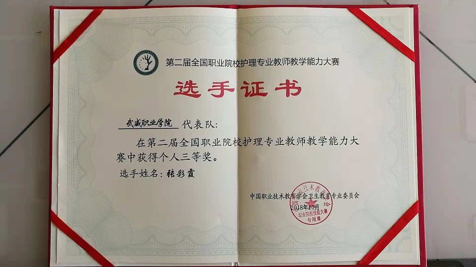 競賽共分為理論考核、說課程和臨床護理技能操作三個部分。其中,臨床護理技能操作部又分為三項,心肺復蘇術(shù)和靜脈輸液操作技術(shù)為必選項目,置胃管技術(shù)和氣管切開護理技術(shù)為抽選項目。經(jīng)過三天緊張激烈的比拼,通過了全部考核內(nèi)容的綜合評定,最終張彩霞老師獲得了三等獎。