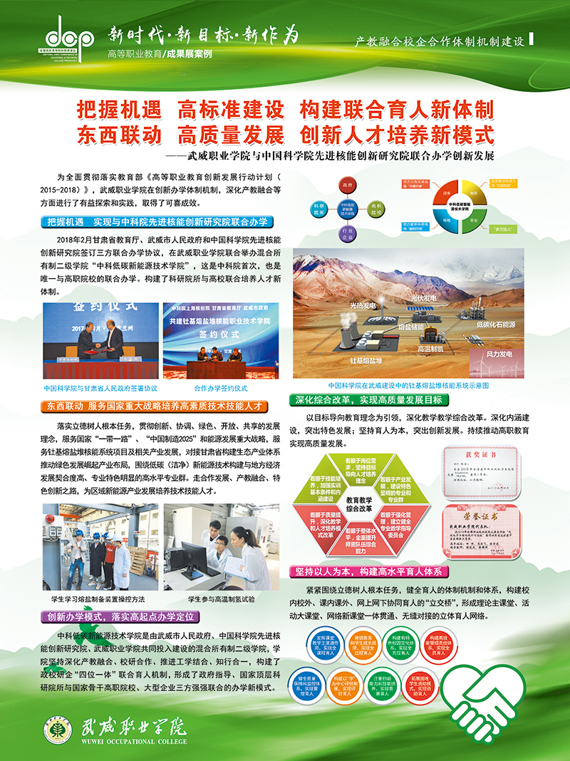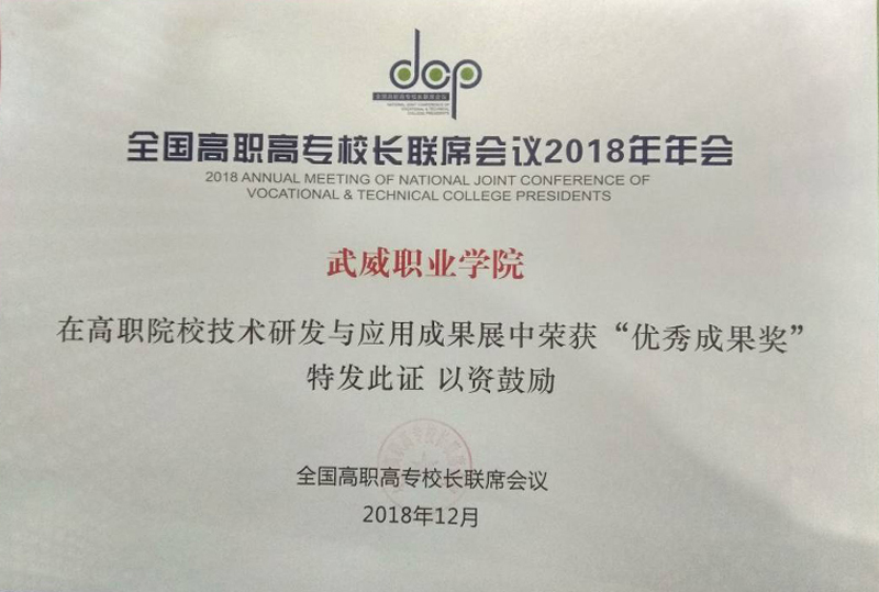 12月8日至9日,學(xué)院黨委書(shū)記、院長(zhǎng)趙明教授、副院長(zhǎng)翟存祥教授帶隊(duì)參加了在福建福州召開(kāi)的全國(guó)高職高專校長(zhǎng)聯(lián)席會(huì)議2018年年會(huì)。學(xué)院自主研發(fā)的“光伏組件智能清潔裝置”榮獲高職院校技術(shù)研發(fā)與應(yīng)用成果 “優(yōu)秀成果獎(jiǎng)”(全國(guó)僅36所高職院校獲此殊榮,甘肅省僅2所),“學(xué)院與中科院先進(jìn)核能創(chuàng)新研究院聯(lián)合辦學(xué)創(chuàng)新發(fā)展”案例入選教育成果案例展。