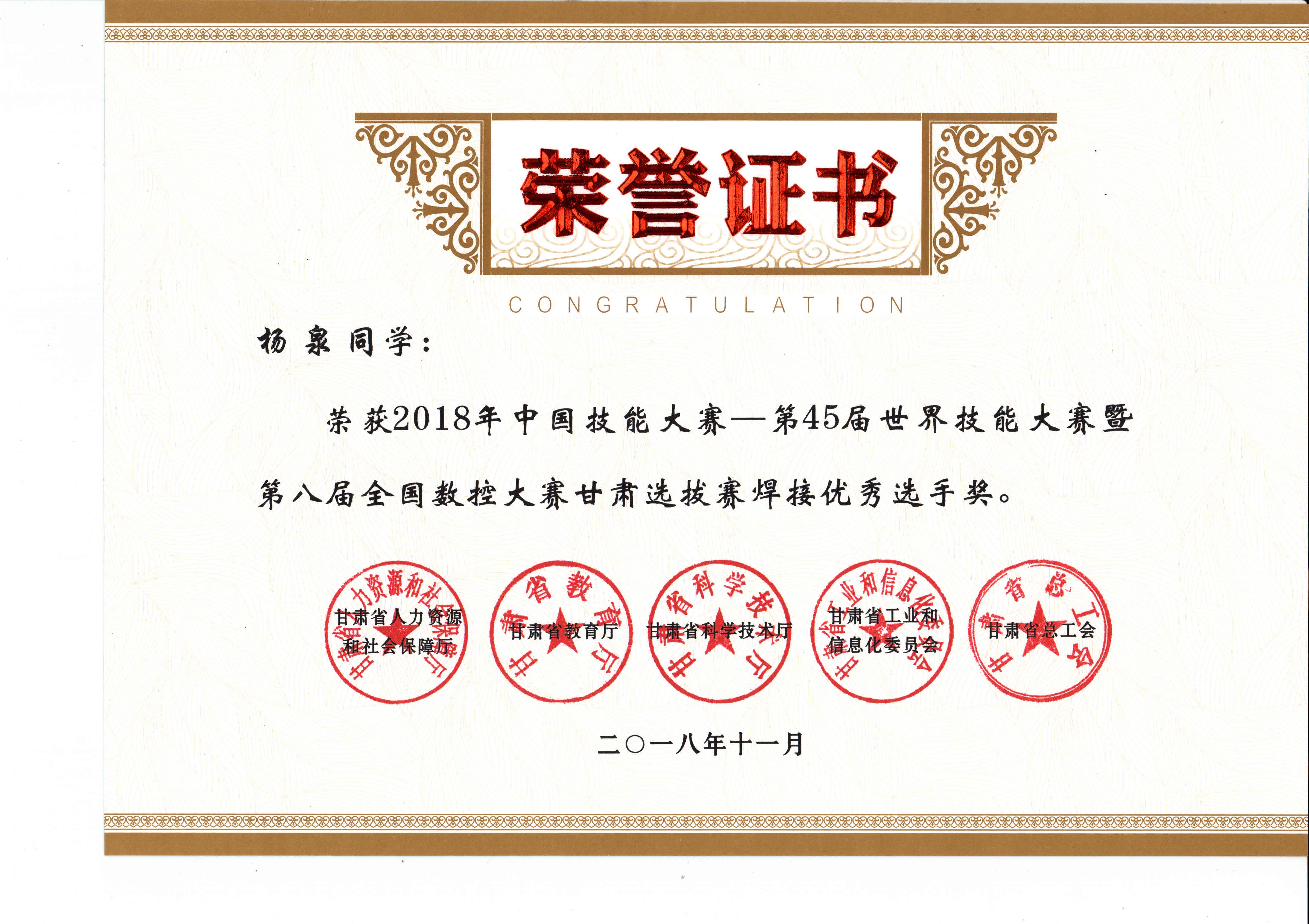 2018年中國(guó)技能大賽--第45屆世界技能大賽暨第八屆全國(guó)數(shù)控大賽甘肅選拔賽(焊接項(xiàng)目)獲獎(jiǎng)證書