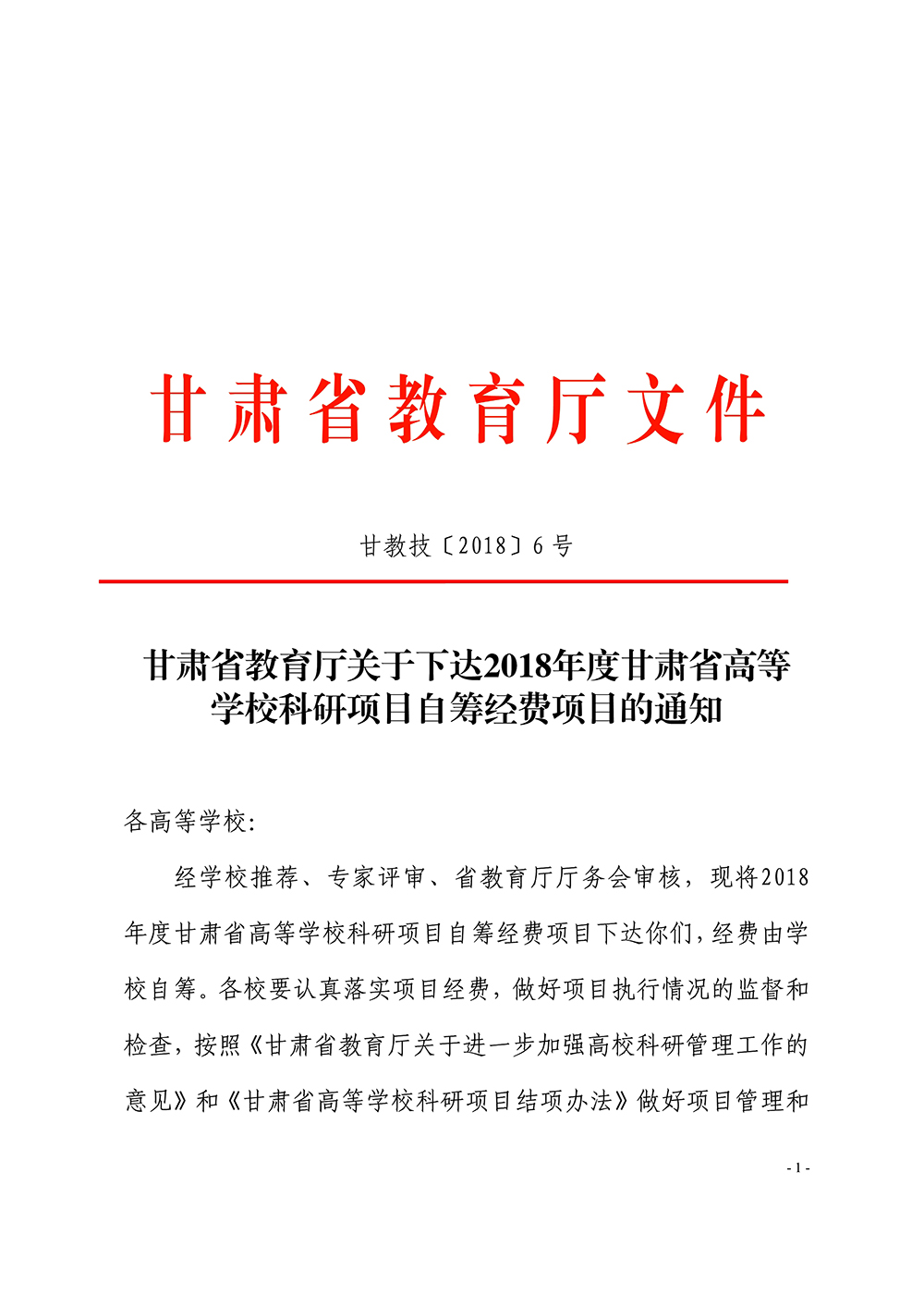 甘肅省教育廳關于下達2018年度甘肅省高等學??蒲许椖孔曰I經(jīng)費項目的通知