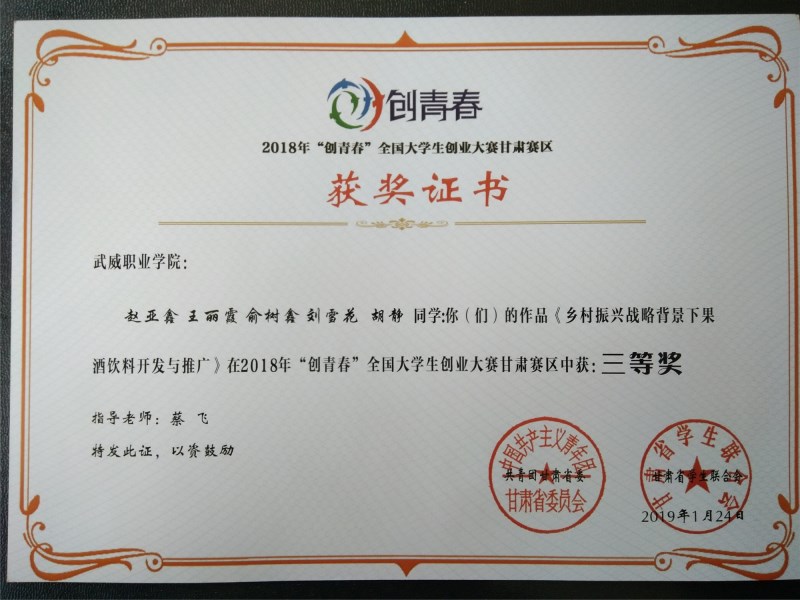 現(xiàn)代農業(yè)技術系兩件作品獲得2018年“創(chuàng)青春”全國大學生創(chuàng)業(yè)大賽甘肅賽區(qū)三等獎