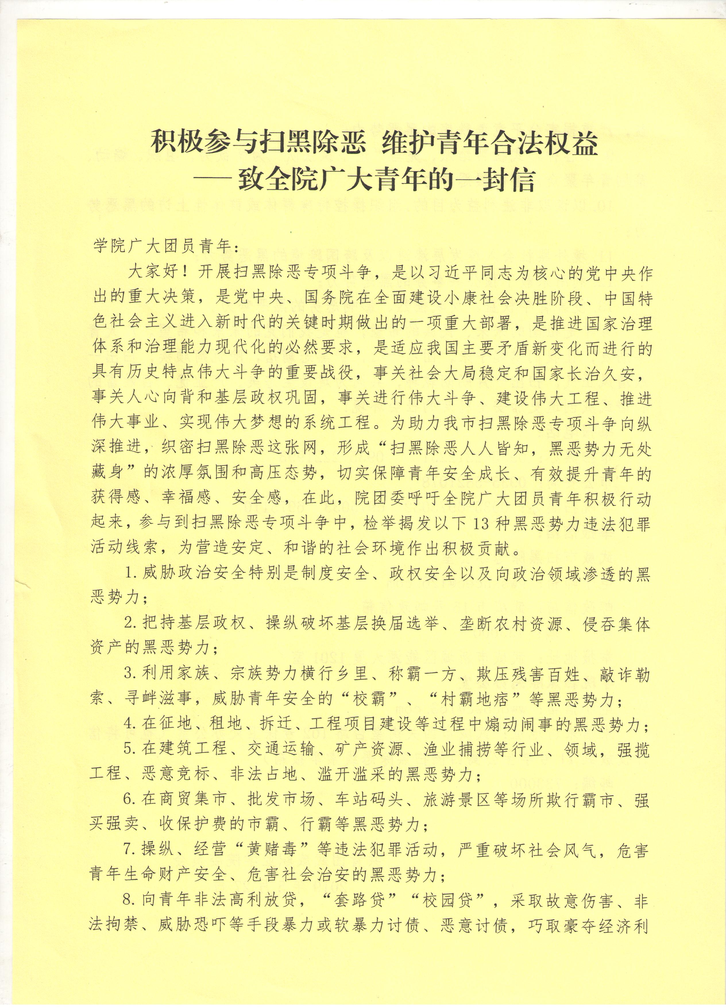 轉(zhuǎn):積極參與掃黑除惡,維護(hù)青年合法權(quán)益—致全院廣大青年的一封信