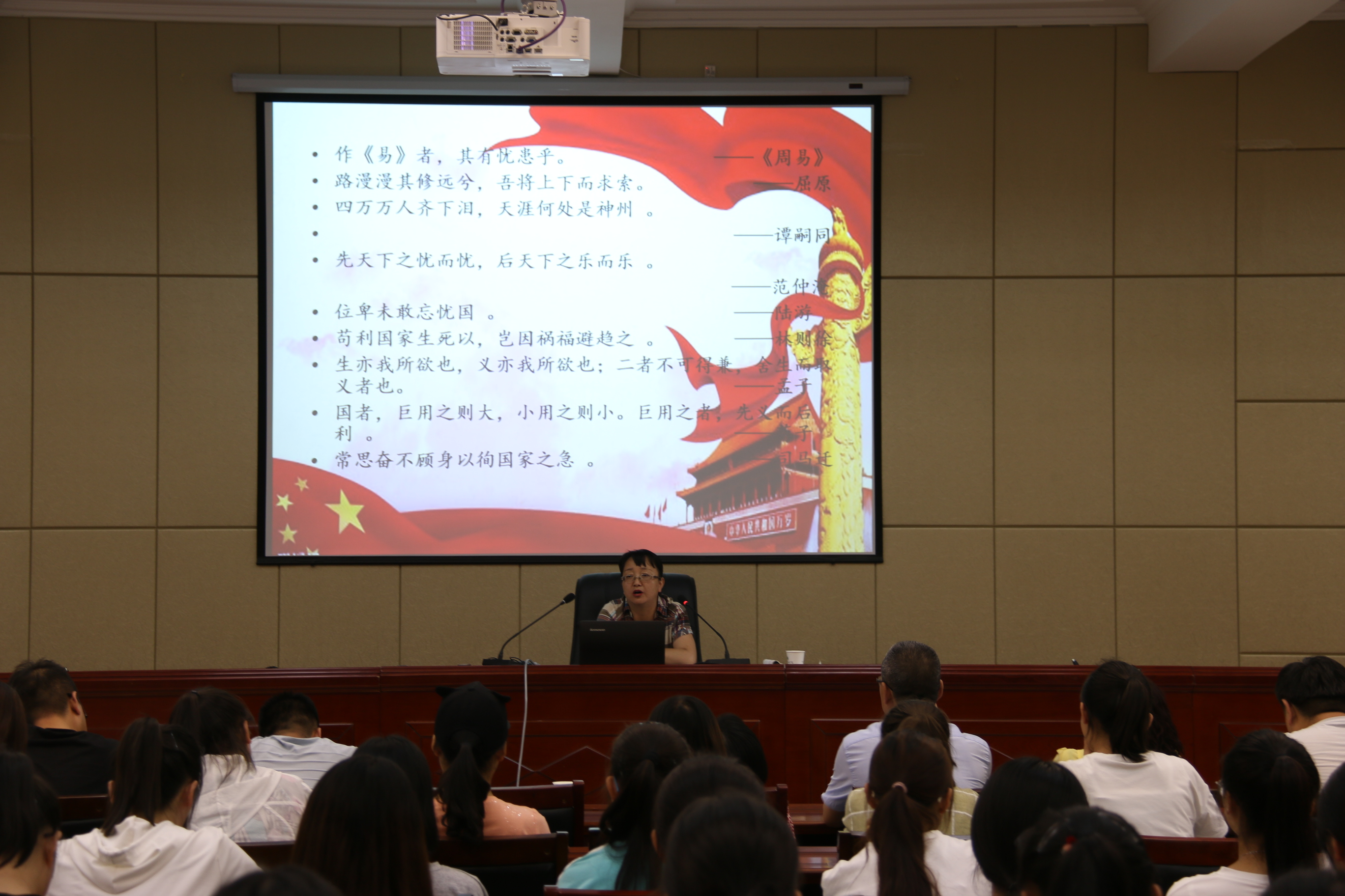田迎春分別從溯源、求理、踐行三個(gè)方面深刻講解了愛國主義精神的傳承與弘揚(yáng)。一是探尋中華民族愛國主義精神的基因,歷史深刻表明,愛國主義自古以來就流淌在中華民族血脈之中,去不掉,打不破,滅不了;二是洞悉當(dāng)代中國愛國主義的思想真諦,指出對新時(shí)代中國青年來說,熱愛祖國是立身之本、成才之基。三是讓愛國主義精神代代相傳、發(fā)揚(yáng)光大,要求新時(shí)代師生要聽黨話、跟黨走,胸懷憂國憂民之心、愛國愛民之情,懂得奉獻(xiàn)祖國、奉獻(xiàn)人民,以一生的真情投入、一輩子的頑強(qiáng)奮斗來體現(xiàn)愛國主義情懷,讓愛國主義的偉大旗幟始終在心中高高飄揚(yáng)!