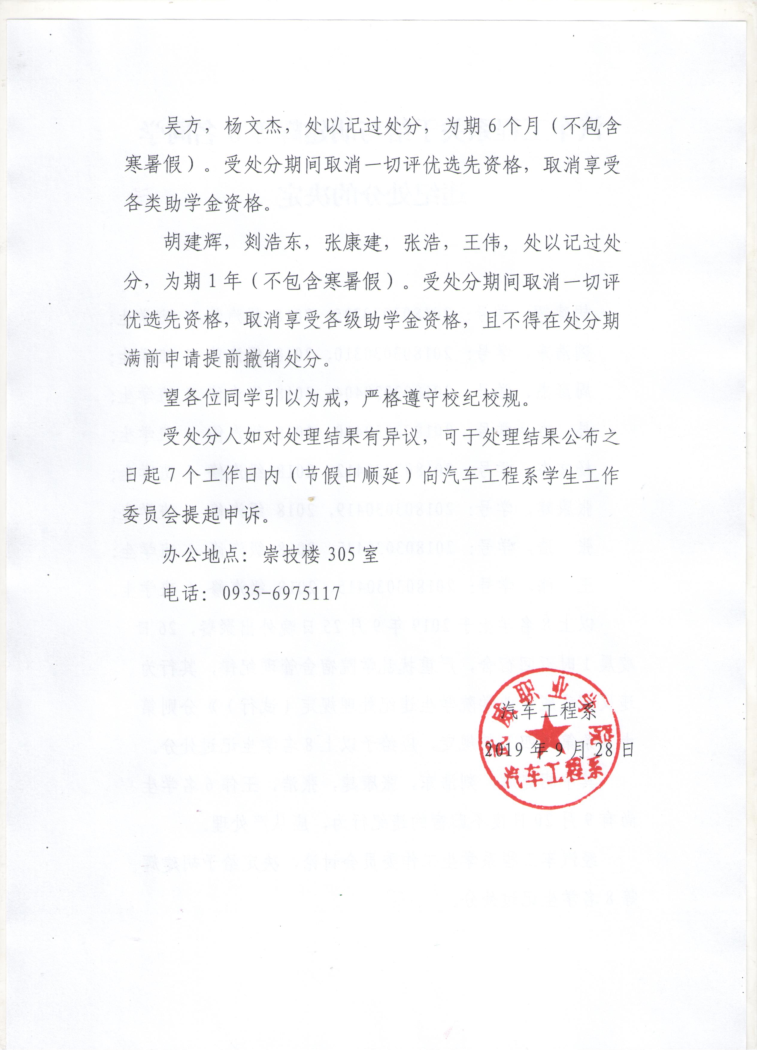 汽車工程系關(guān)于給與胡建輝等8名同學違紀處分的決定