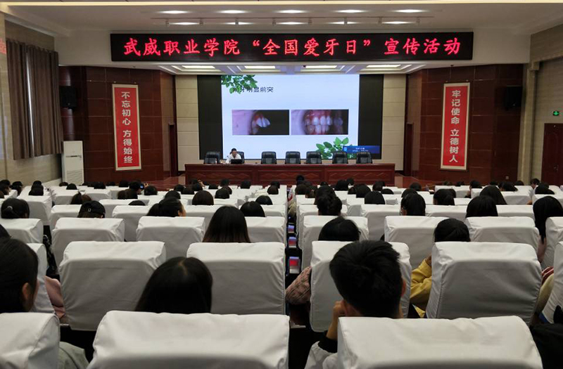 學(xué)院婦聯(lián)邀請武威腫瘤醫(yī)院口腔科主任韓冬做題為《青年口腔保健知識》的講座。韓冬結(jié)合多年口腔疾病診療經(jīng)驗(yàn),從青年口腔衛(wèi)生、口腔疾病預(yù)防及口腔正畸處理等方面入手,做了精彩講解,借助牙齒道具展示了正確的刷牙方法,并對同學(xué)們的各類口腔問題作了解答。講座結(jié)束后,武威腫瘤醫(yī)院和愛牙協(xié)會在大學(xué)生活動中心前廣場為同學(xué)們開展義診活動,發(fā)放口腔健康宣傳資料600余份。