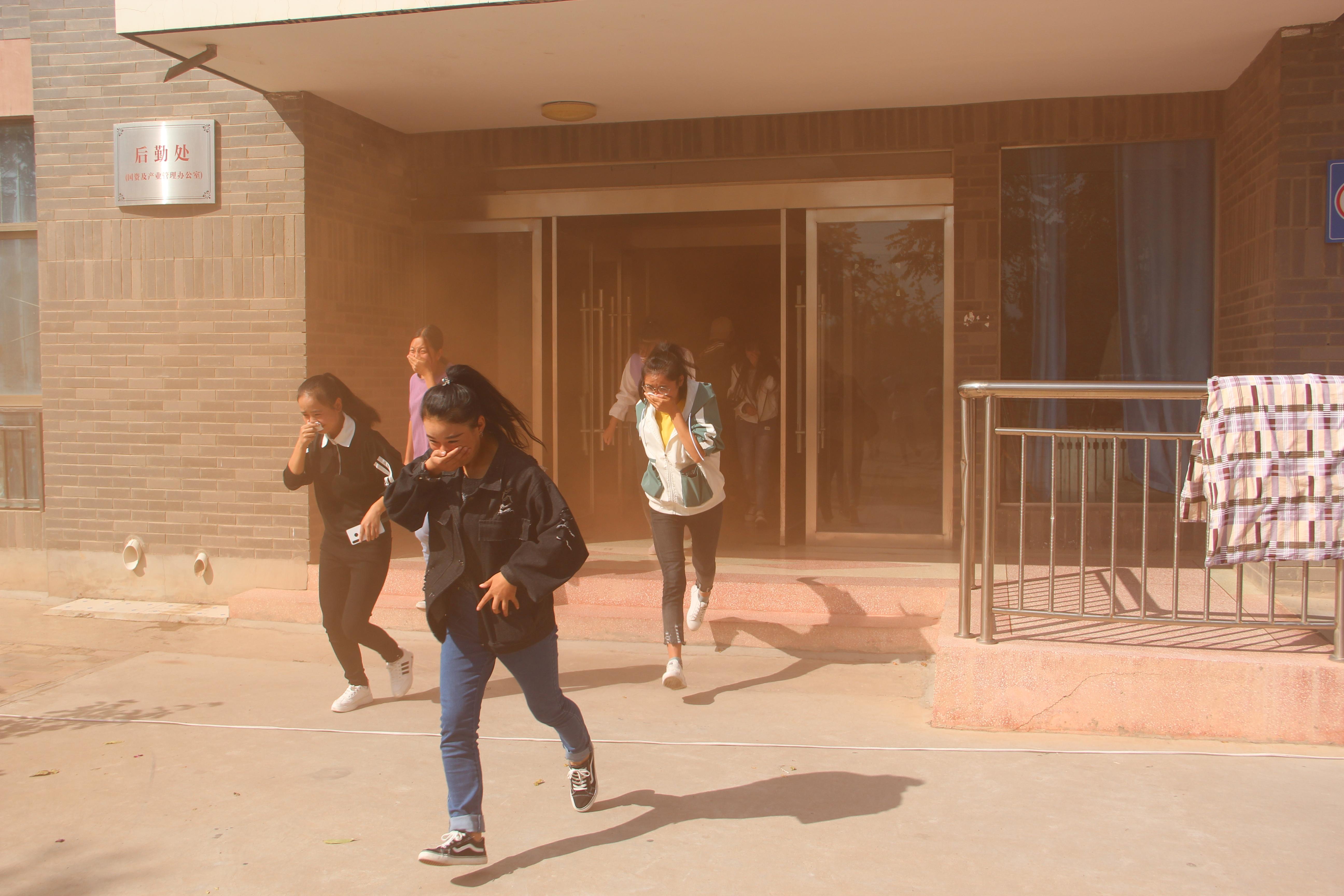 15時(shí)10分,疏散演練正式開始。隨著火災(zāi)警報(bào)響起,學(xué)生公寓樓冒出滾滾濃煙,公寓管理人員迅速打開所有應(yīng)急疏散通道,組織學(xué)生有序疏散。在安保人員的協(xié)助下,同學(xué)們用濕毛巾捂住口鼻,快速、有序從疏散通道撤離到了安全地帶。