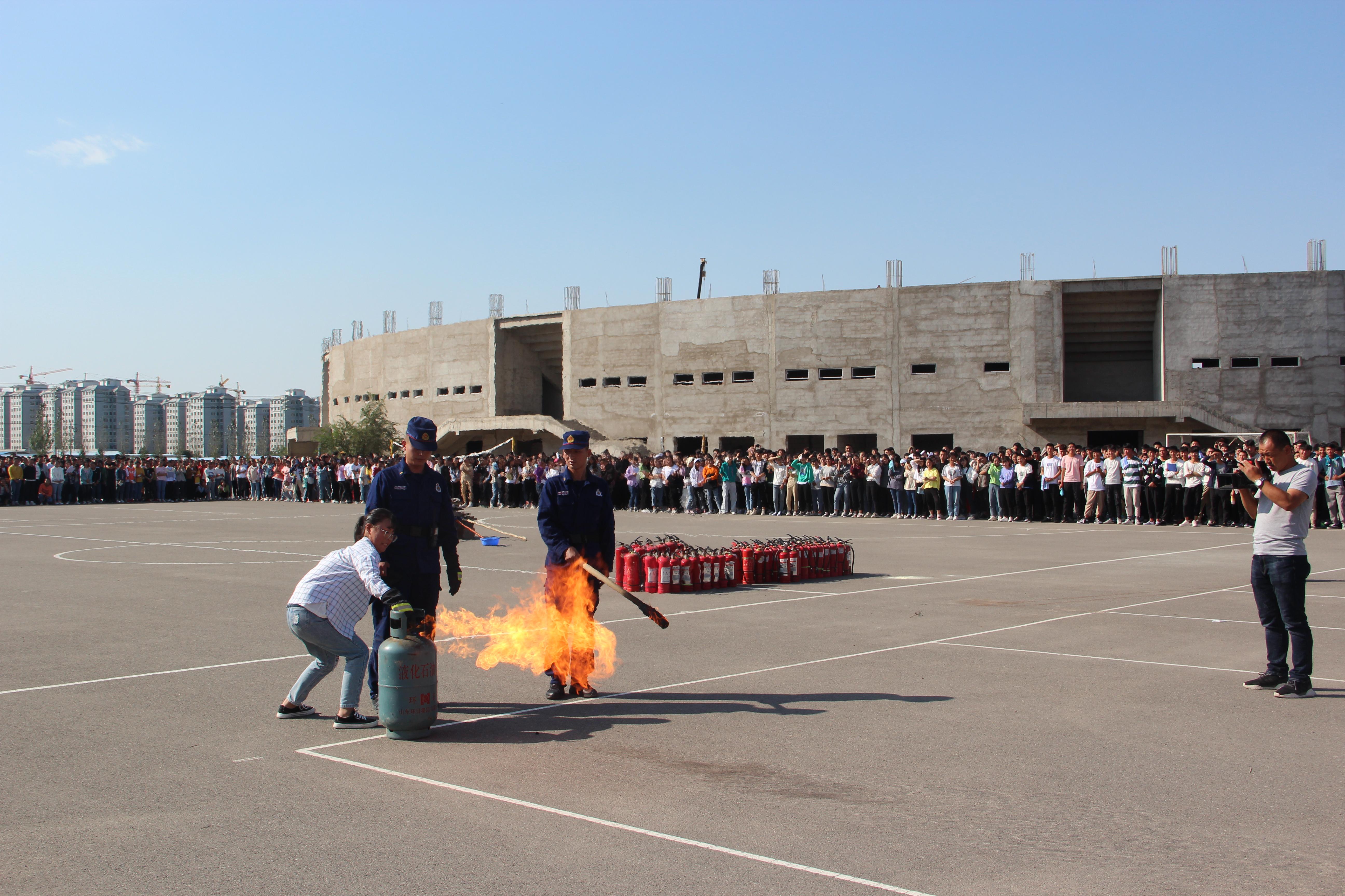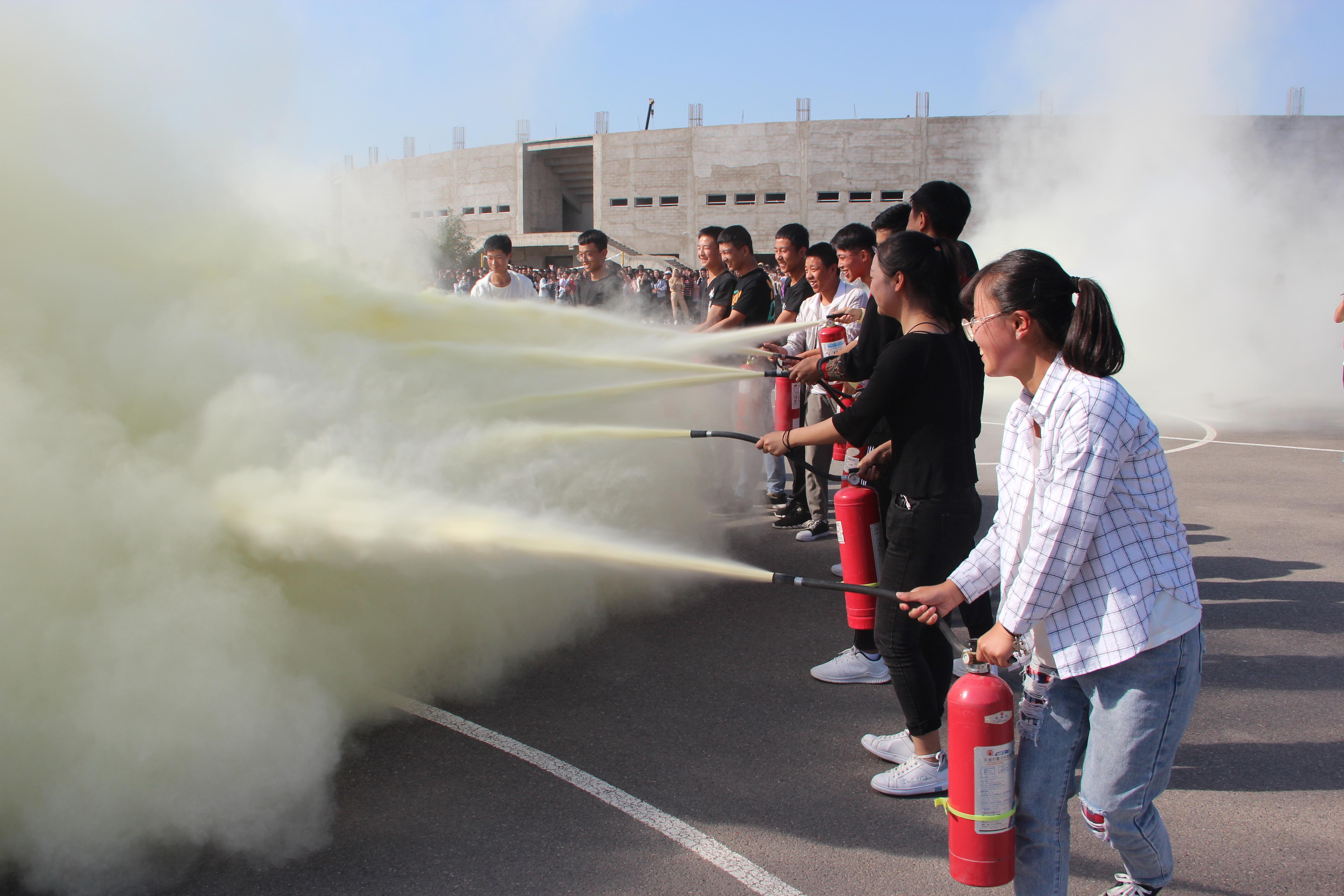隨后,2019級新生整隊(duì)到操場參加了滅火演練。在消防隊(duì)員的講解和示范下,同學(xué)們現(xiàn)場學(xué)習(xí)了應(yīng)急逃生和消防安全常識(shí),部分師生代表、食堂工作人員親身體驗(yàn)了處置滅火器著火液化氣瓶、干粉滅火、通過模擬煙室逃生等操作。