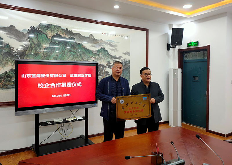 在捐贈儀式上,楊兆永總經(jīng)理介紹了山東藍(lán)海股份有限公司做了介紹,雙方在人才需求、專業(yè)課程設(shè)置開發(fā)、雙師型師資培養(yǎng)、教學(xué)組織實(shí)習(xí)質(zhì)量評估、就業(yè)服務(wù)等多方面合作近十年,已經(jīng)將校企雙方緊密聯(lián)合在一起,同時希望今后繼續(xù)不斷在師資隊(duì)伍培養(yǎng)、人才培養(yǎng)、教育教學(xué)繼續(xù)加強(qiáng)合作,實(shí)現(xiàn)雙贏,共同發(fā)展。