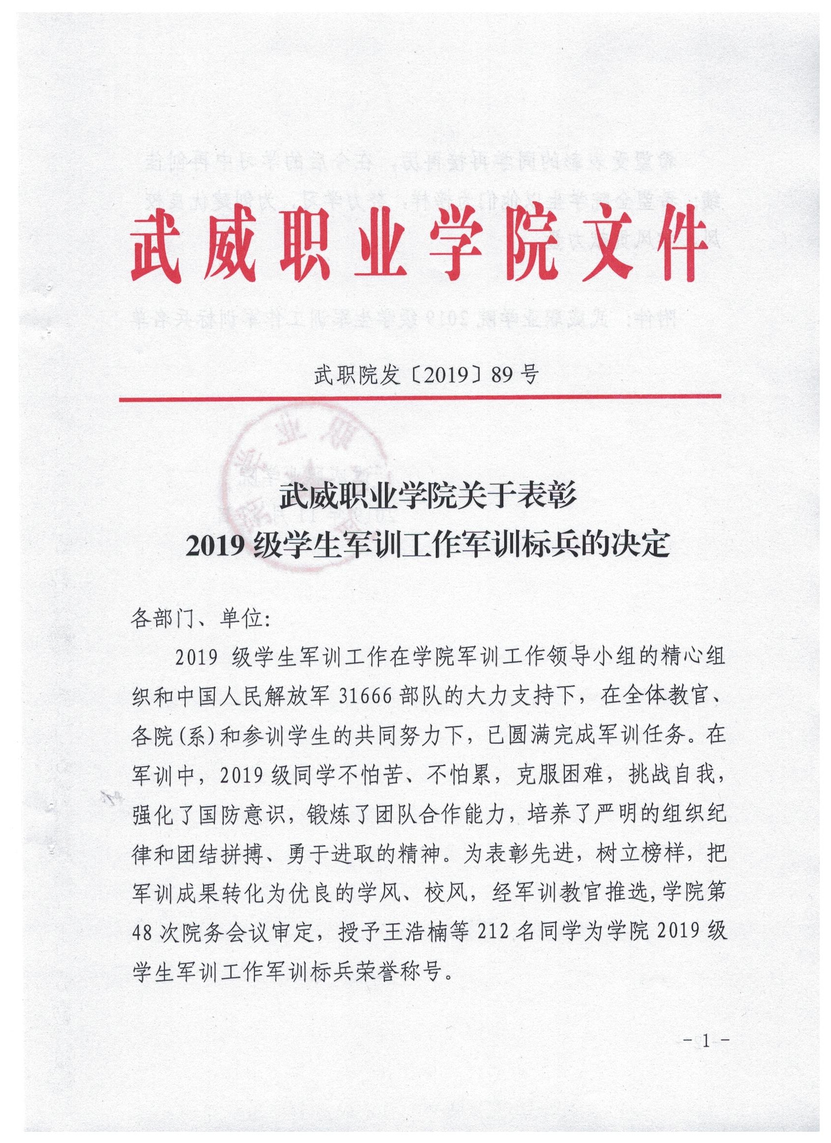 武威職業(yè)學(xué)院關(guān)于表彰2019級學(xué)生軍訓(xùn)工作先進集體、先進個人的決定