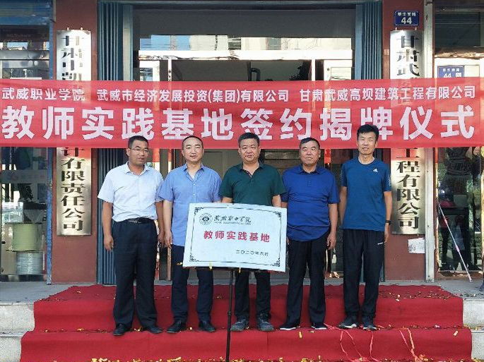 2020年8月9日,學(xué)院聯(lián)合武威市經(jīng)濟(jì)發(fā)展(集團(tuán))有限公司、甘肅武威高壩建筑工程有限公司,在甘肅武威高壩建筑工程有限公司大樓前舉行武威職業(yè)學(xué)院教師實(shí)踐基地簽約揭牌儀式。學(xué)院黨委書(shū)記、院長(zhǎng)趙明,基建處負(fù)責(zé)人賈龍,建筑工程系副主任蔡濟(jì)眾,黨建負(fù)責(zé)人孫潤(rùn)元;武威市經(jīng)濟(jì)發(fā)展(集團(tuán))有限公司董事長(zhǎng)崔國(guó)斌、副董事長(zhǎng)董英,甘肅武威高壩建筑工程有限公司總經(jīng)理周勝年出席簽約揭牌儀式。