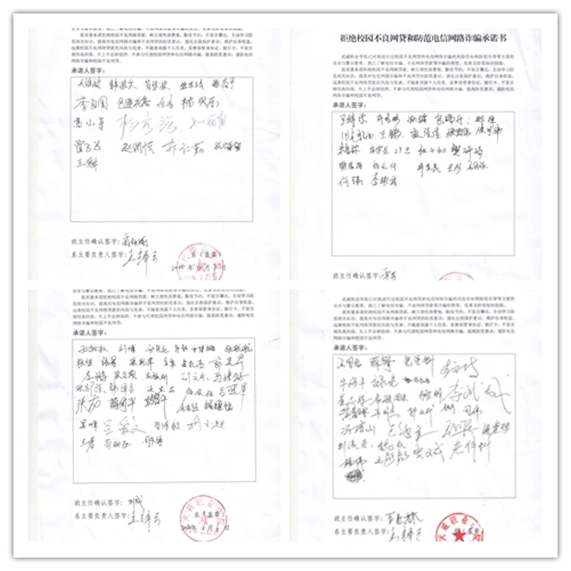??對(duì)學(xué)生進(jìn)行校園不良網(wǎng)貸和電信網(wǎng)絡(luò)詐騙的風(fēng)險(xiǎn)告知和防范引導(dǎo)等方面的安全與警示教育,讓學(xué)生了解電信詐騙、不良網(wǎng)絡(luò)貸款等詐騙的類型、危害及防范知識(shí)技能。自愿簽訂拒絕不良網(wǎng)貸和防范電信網(wǎng)絡(luò)詐騙承諾書。