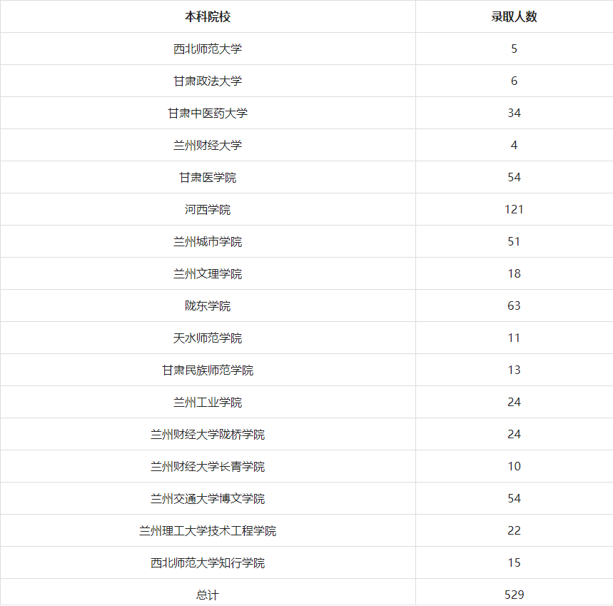 2020年甘肅省普通高等學校專升本第一批、第二批考試招生工作已圓滿結(jié)束。我院2020屆畢業(yè)生捷報頻傳,創(chuàng)下了歷年“專升本”升學的最好成績。726名學生報名參加考試,有529名學生被省內(nèi)本科院校錄取,錄取率為72.87%。