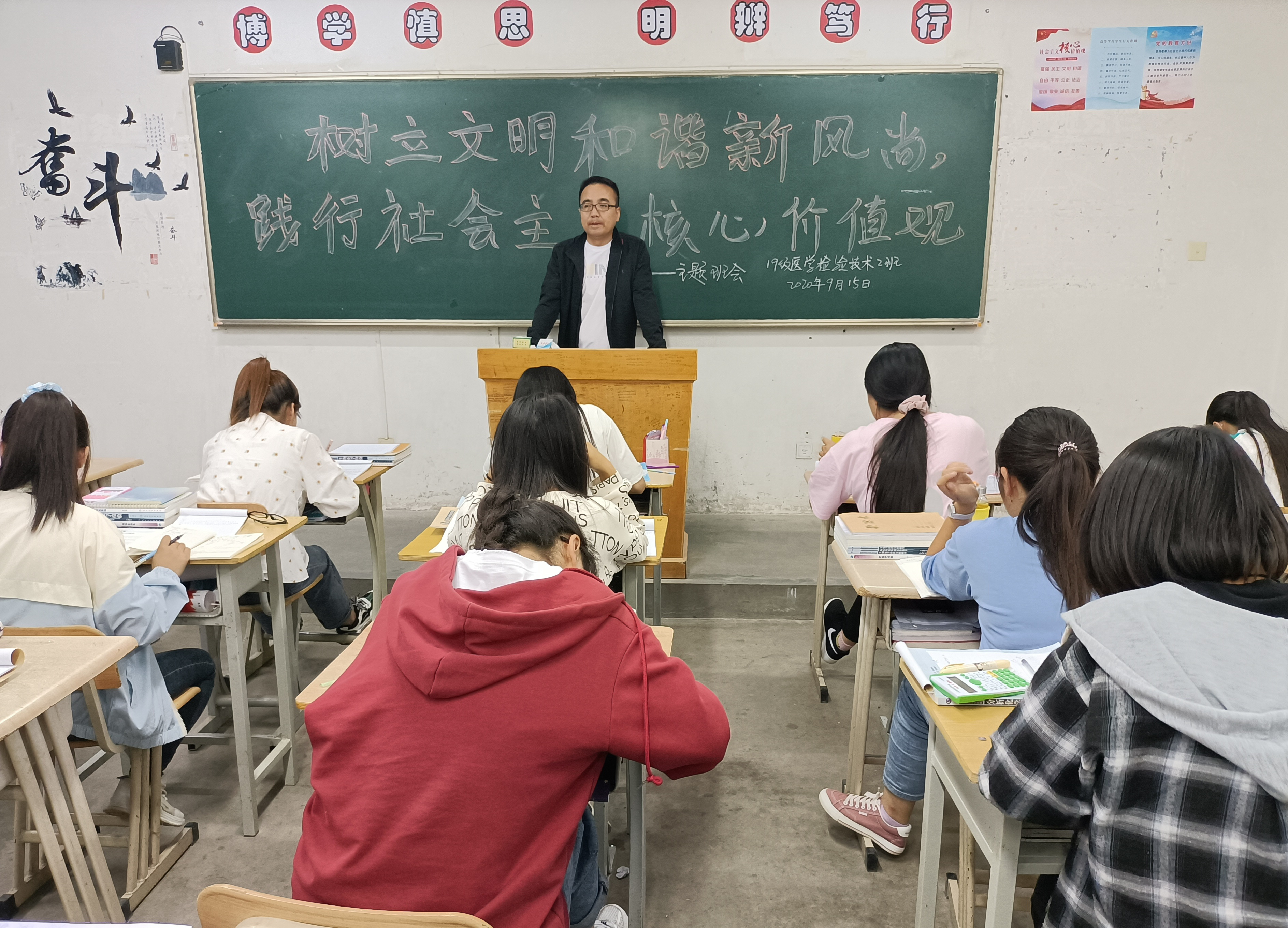 ?為深入學(xué)習(xí)習(xí)近平新時(shí)代中國(guó)特色社會(huì)主義思想和黨的十九大、十九屆四中全會(huì)精神,堅(jiān)決落實(shí)學(xué)院關(guān)于文明校園和文明城市創(chuàng)建的各項(xiàng)安排部署,深入推進(jìn)制止餐飲浪費(fèi)行為系列活動(dòng),團(tuán)結(jié)引領(lǐng)我系師生積極踐行社會(huì)主義核心價(jià)值觀,樹(shù)立文明和諧新風(fēng)尚。醫(yī)學(xué)技術(shù)與信息管理系各教學(xué)班于2020年9月15日開(kāi)展了“樹(shù)立文明新風(fēng)尚,踐行社會(huì)主義核心價(jià)值觀”主題班會(huì)教育活動(dòng)。