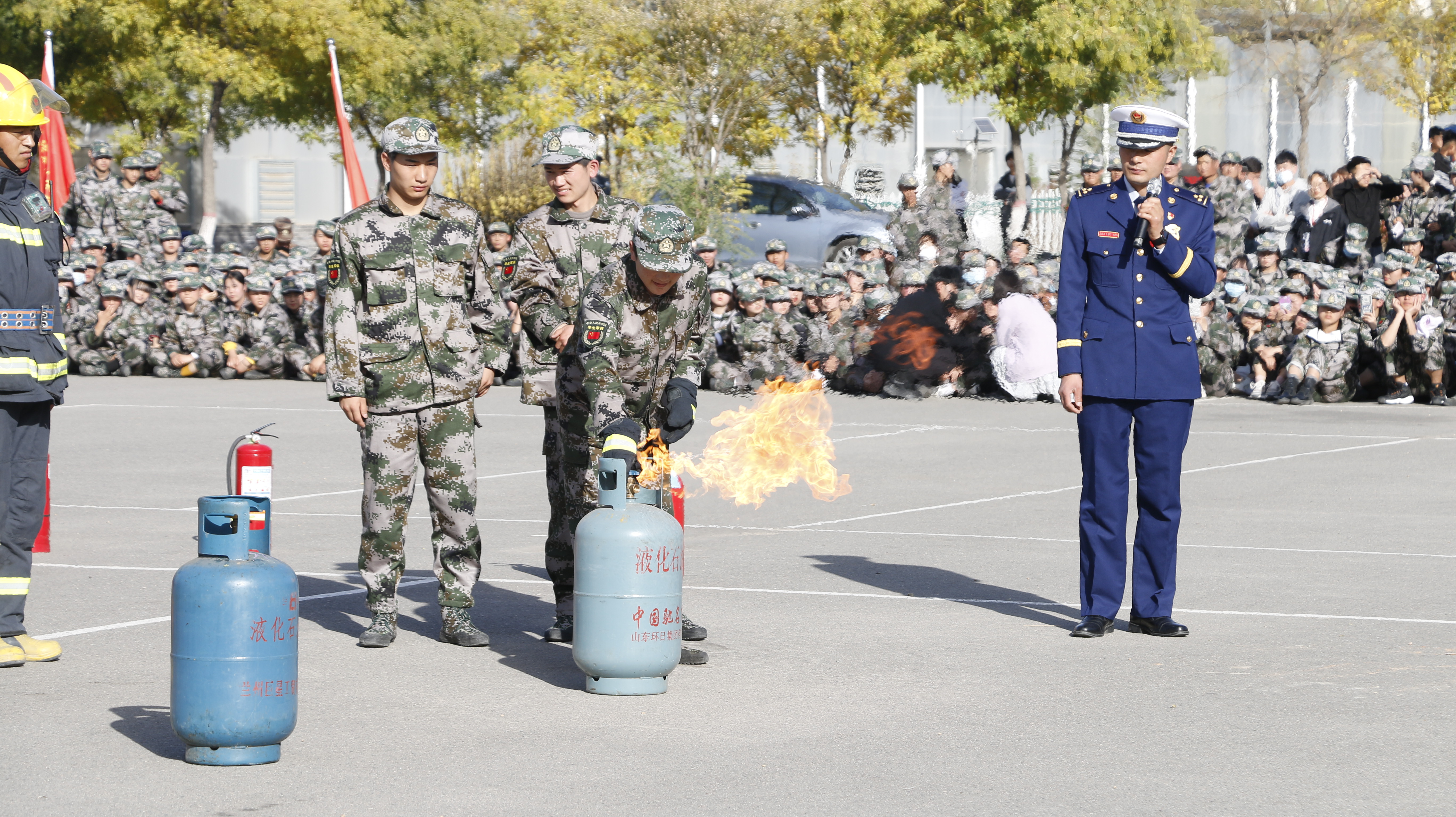 隨后,2020級全體新生整隊到操場參加了滅火演練。在消防救援中隊指戰(zhàn)員的講解和示范下,同學們學習了應急逃生、火災報警和滅火器使用等消防安全常識,學生代表體驗了處置液化氣瓶滅火、油鍋滅火、干粉滅火器滅火等操作,在實戰(zhàn)中提高了消防應急能力。