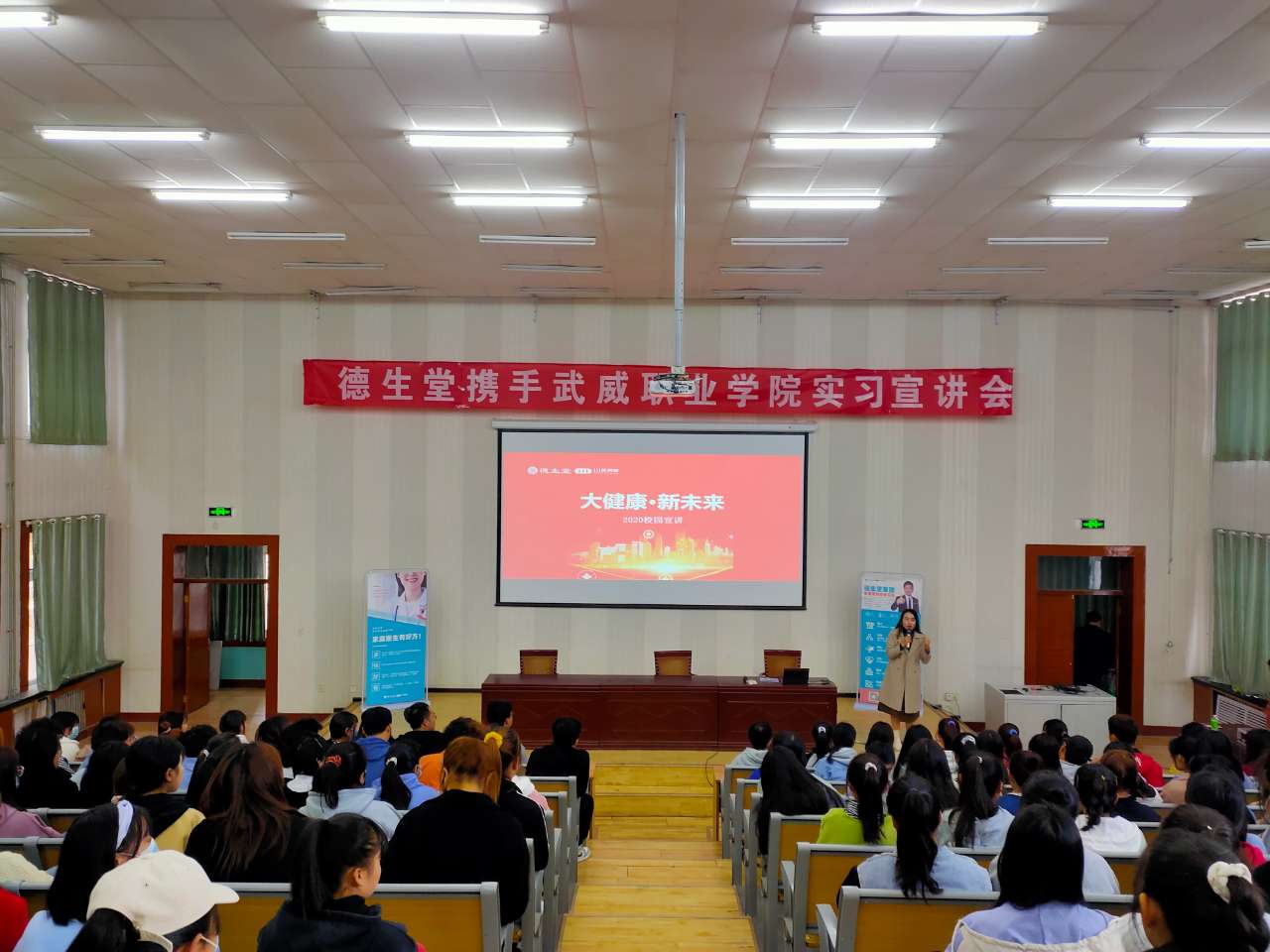 2020年11月5日,武威職業(yè)學院藥學系攜手德生堂在正德廳舉辦實習宣講會。藥學系黨總支書記、主任魏潤明、藥學系副主任楊建美、德生堂集團武威區(qū)域經(jīng)理呂福英及2021屆172名畢業(yè)生參加宣講會。