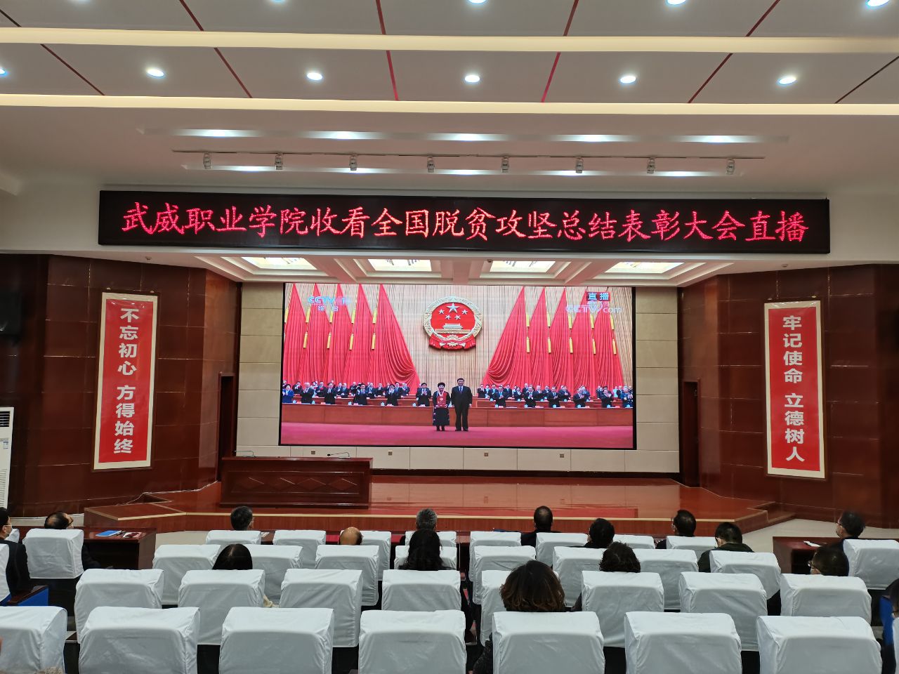 2月25日上午,武威職業(yè)學(xué)院組織干部職工收看全國(guó)脫貧攻堅(jiān)總結(jié)表彰大會(huì)。學(xué)院黨委書(shū)記、院長(zhǎng)趙明,黨委副書(shū)記翟存祥,黨委委員、副院長(zhǎng)王永緒,黨委委員、紀(jì)委書(shū)記、監(jiān)察專員陳曉煜,黨委委員、副院長(zhǎng)張開(kāi)禮和全體幫扶干部、副科級(jí)以上干部在菁英廳集中進(jìn)行了收看,其他教職工通過(guò)電腦和手機(jī)直播觀看了大會(huì)盛況。