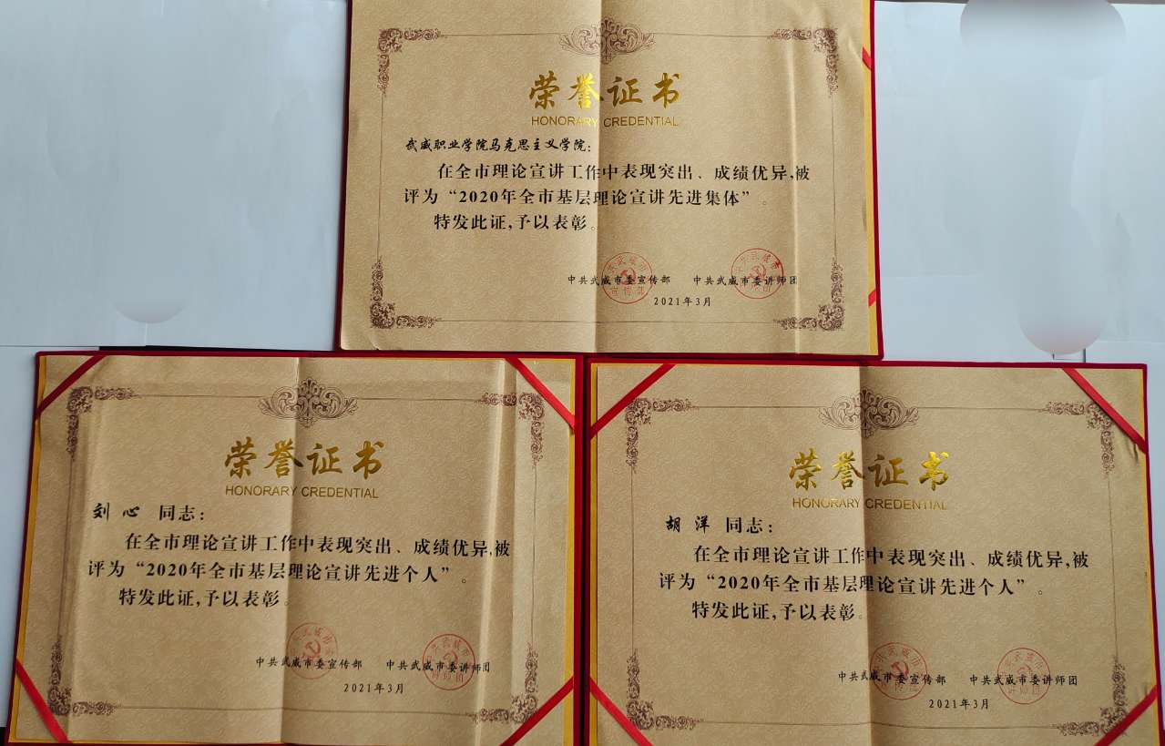 3月25日下午,武威市委宣傳部組織召開了“黨史教育專題宣講動員會暨2020年宣講工作先進(jìn)集體和個(gè)人表彰會”。武威職業(yè)學(xué)院馬克思主義學(xué)院被授予“2020年全市基層理論宣講先進(jìn)集體”榮譽(yù)稱號,同時(shí)馬克思主義學(xué)院教師、翟存祥名師工作室成員劉心、胡洋被授予“2020年全市基層理論宣講先進(jìn)個(gè)人”榮譽(yù)稱號。
