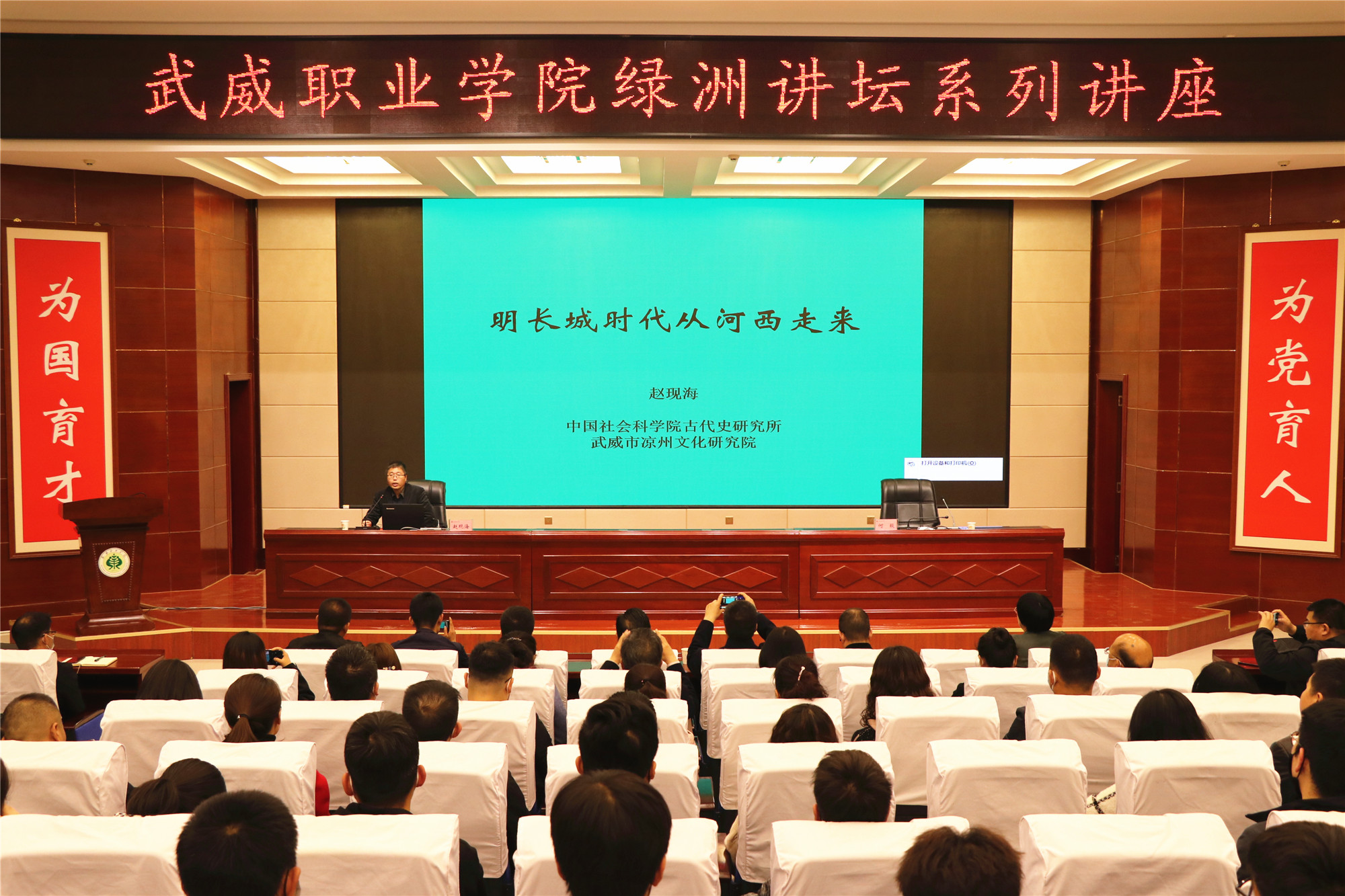 4月2日,學院綠洲講壇第40期開講,由中國社會科學院古代史研究所研究員,明史研究室主任,市涼州文化研究院副院長趙現(xiàn)海同志為師生進行《明長城時代從河西走來》的專題報告。學院領導、涼州文化研究院相關領導和工作人員,西關科技巷社區(qū)領導和學院師生代表220人參加了報告會。黨委委員、副院長何毅主持報告會。