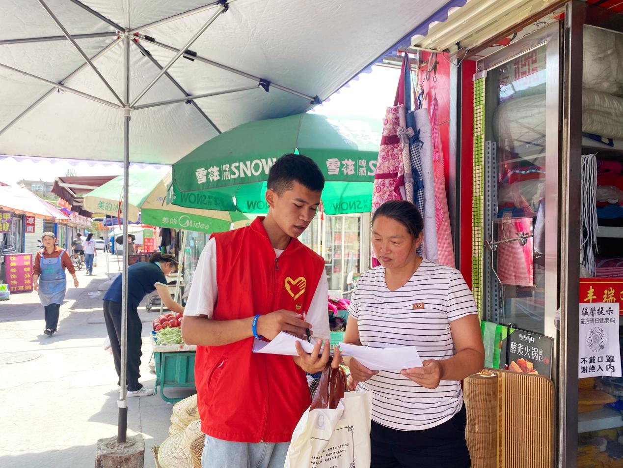 圖為實踐隊員在涼州區(qū)武南鎮(zhèn)為商戶發(fā)放推普資料