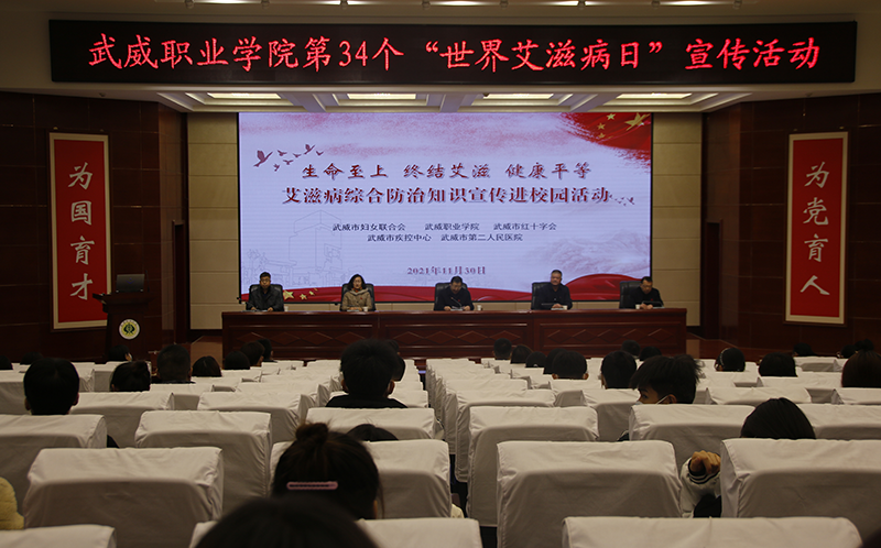 11月30日,學(xué)院在菁英廳開展了“生命至上 終結(jié)艾滋 健康平等”艾滋病綜合防治知識(shí)宣傳進(jìn)校園活動(dòng)。市疾控中心工會(huì)主席張富國、市婦聯(lián)副主席張惠華、學(xué)院黨委委員、副院長王守云,市第二人民醫(yī)院院長滕亮出席活動(dòng),活動(dòng)由學(xué)院護(hù)理系黨總支書記張建輝主持,市紅十字會(huì)、市疾控中心、天馬行市民云數(shù)據(jù)有限公司工作人員及武威職業(yè)學(xué)院師生代表參加活動(dòng)。