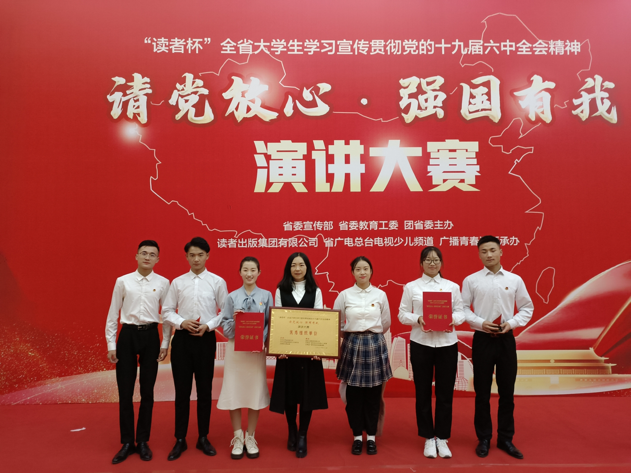 12月28日—29日,由省委宣傳部、省教育工委、團省委主辦的“讀者杯”全省大學生學習宣傳貫徹黨的十九屆六中全會精神“請黨放心 強國有我”主題演講大賽決賽在甘肅省廣電總臺舉行,甘肅省委常委、宣傳部部長王嘉毅出席活動并為獲獎選手頒獎。