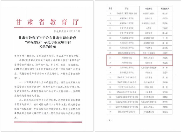 中科低碳新能源技術(shù)學院黃述杰負責的“光伏工程技術(shù)”和經(jīng)濟管理學院晉藝波負責的“旅游管理”2個專業(yè)獲評甘肅省職業(yè)教育“課程思政”示范專業(yè)。