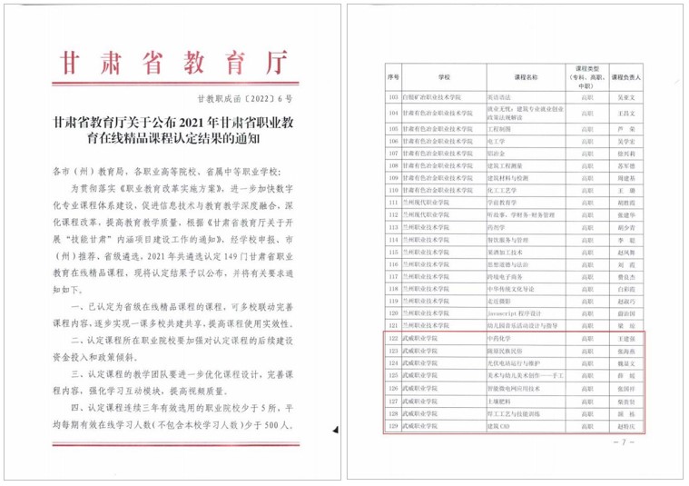 藥學院王建強負責的《中藥化學》、經(jīng)濟管理學院張海燕負責的《隴原民族民俗》、中科低碳新能源技術(shù)學院魏顯文負責的《光伏電站運行與維護》、張國祥負責的《智能微電網(wǎng)應(yīng)用技術(shù)》、藝術(shù)與教育學院薛媛負責的《美術(shù)與幼兒美術(shù)創(chuàng)作——手工》、現(xiàn)代農(nóng)業(yè)學院柴貴賢負責的《土壤肥料》、工程技術(shù)學院頡棟負責的《焊接工藝與技能訓練》、趙特慶負責的《建筑CAD》8門課程獲評甘肅職業(yè)教育在線精品課程。
