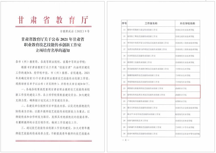 創(chuàng)新創(chuàng)業(yè)中心顏魯薪負責的“顏魯薪太陽能利用技藝技能傳承創(chuàng)新工作室”和藝術(shù)與教育學院藍明東負責的“藍明東傳統(tǒng)造型藝術(shù)技藝技能傳承創(chuàng)新工作室”獲評甘肅省職業(yè)教育技藝技能傳承創(chuàng)新工作室。