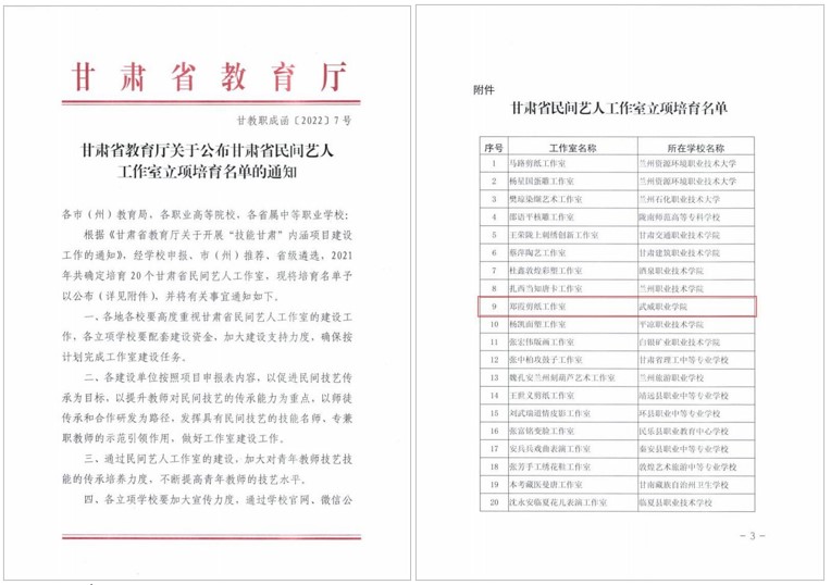民間藝人、學校非遺技能指導教師鄭霞合作申報的“鄭霞剪紙工作室”,獲評甘肅省民間藝人工作室。
