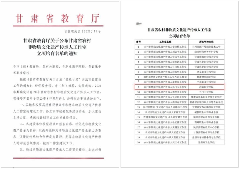 國家級非物質(zhì)文化遺產(chǎn)傳承人、學校攻鼓子藝術(shù)團指導教師楊門元合作申報的“農(nóng)村非物質(zhì)文化遺產(chǎn)傳承人楊門元工作室”,獲評甘肅省農(nóng)村非物質(zhì)文化遺產(chǎn)傳承人工作室。