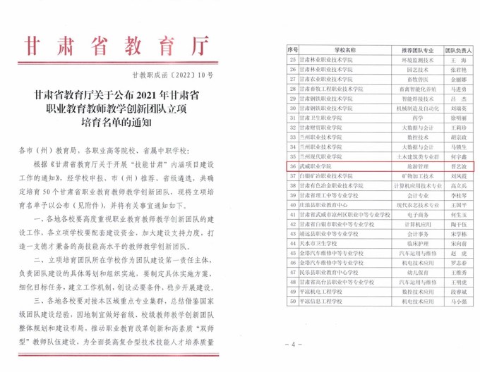 經(jīng)濟管理學院晉藝波負責的“旅游管理”專業(yè)教學團隊獲評甘肅省職業(yè)教育教師教學創(chuàng)新團隊。