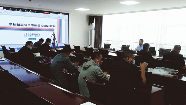 演練結(jié)束后,甘肅省武威腫瘤醫(yī)院感染管理科疫情防控專家在能源科技樓811會議室對學校疫情防控領(lǐng)導(dǎo)小組全體成員進行疫情防控知識培訓(xùn),全體輔導(dǎo)員、班主任,醫(yī)務(wù)室全體人員及其他相關(guān)人員通過在線視頻學習,培訓(xùn)會議由學校副校長王永緒主持。