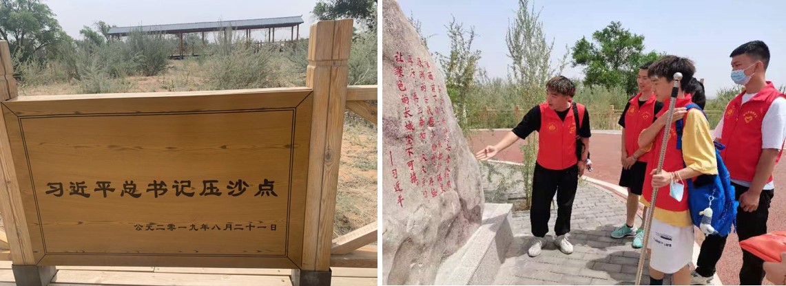 在兩山實(shí)踐基地負(fù)責(zé)人的指引下,我們參觀了習(xí)近平總書記曾經(jīng)到達(dá)過八步沙參與壓沙的目的地,認(rèn)真學(xué)習(xí)了習(xí)近平總書記在八步沙的講話精神,深刻領(lǐng)悟到了習(xí)近平總書記號召大家要弘揚(yáng)八步沙“六老漢”困難面前不低頭,敢把沙漠變綠洲的當(dāng)代愚公精神,在今后,我們將把這種精融入到實(shí)踐當(dāng)中,不負(fù)青春,不負(fù)韶華積極投身于祖國建設(shè)中。
