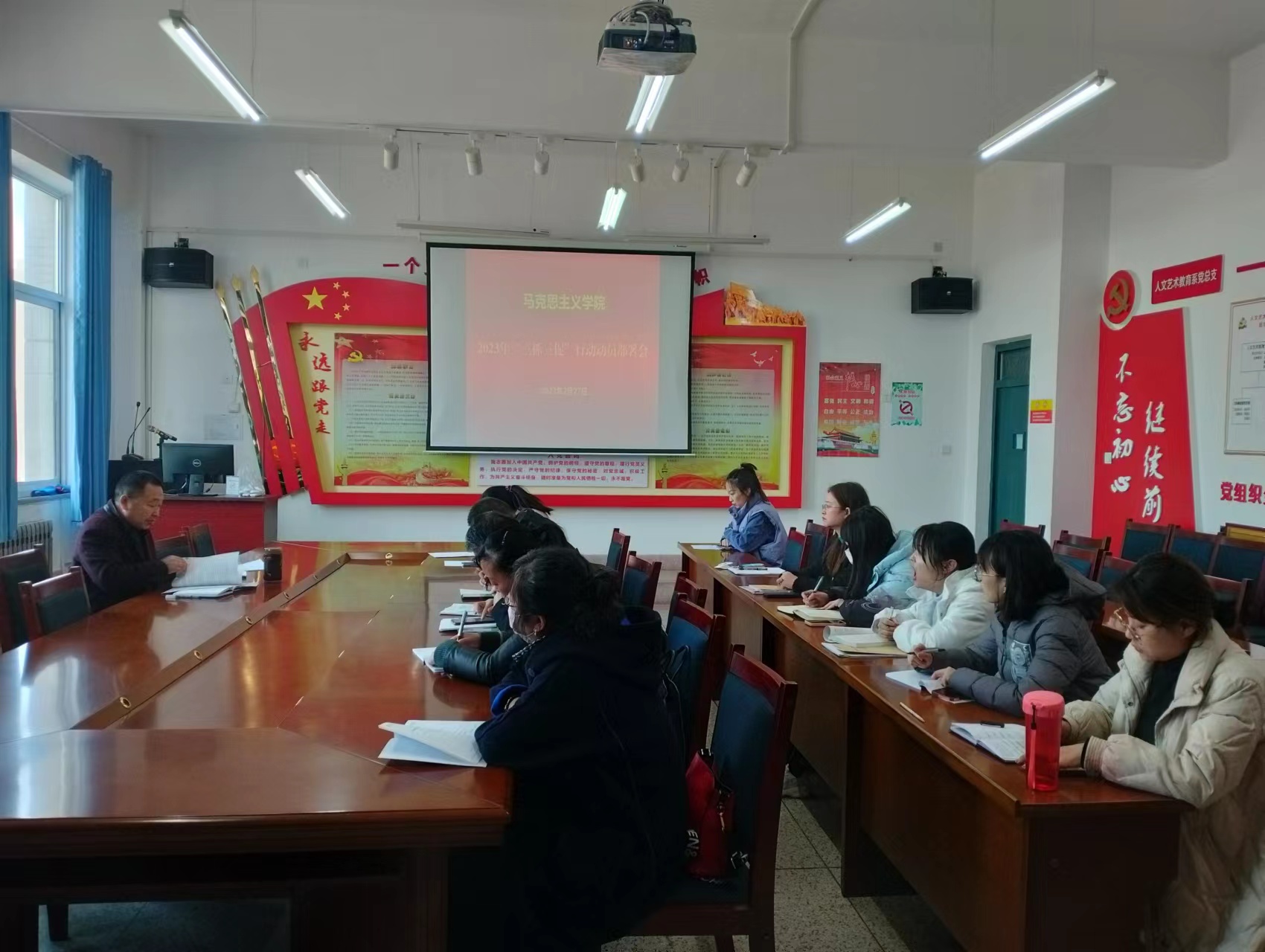 近日,按照學(xué)?!叭ト佟毙袆?dòng)動(dòng)員部署會(huì)要求,馬克思主義學(xué)院第一時(shí)間召開(kāi)會(huì)議,統(tǒng)一思想,明確任務(wù),召開(kāi)“三抓三促”行動(dòng)動(dòng)員部署會(huì),學(xué)院負(fù)責(zé)人劉心主持會(huì)議,全體思政課教師參加了會(huì)議。