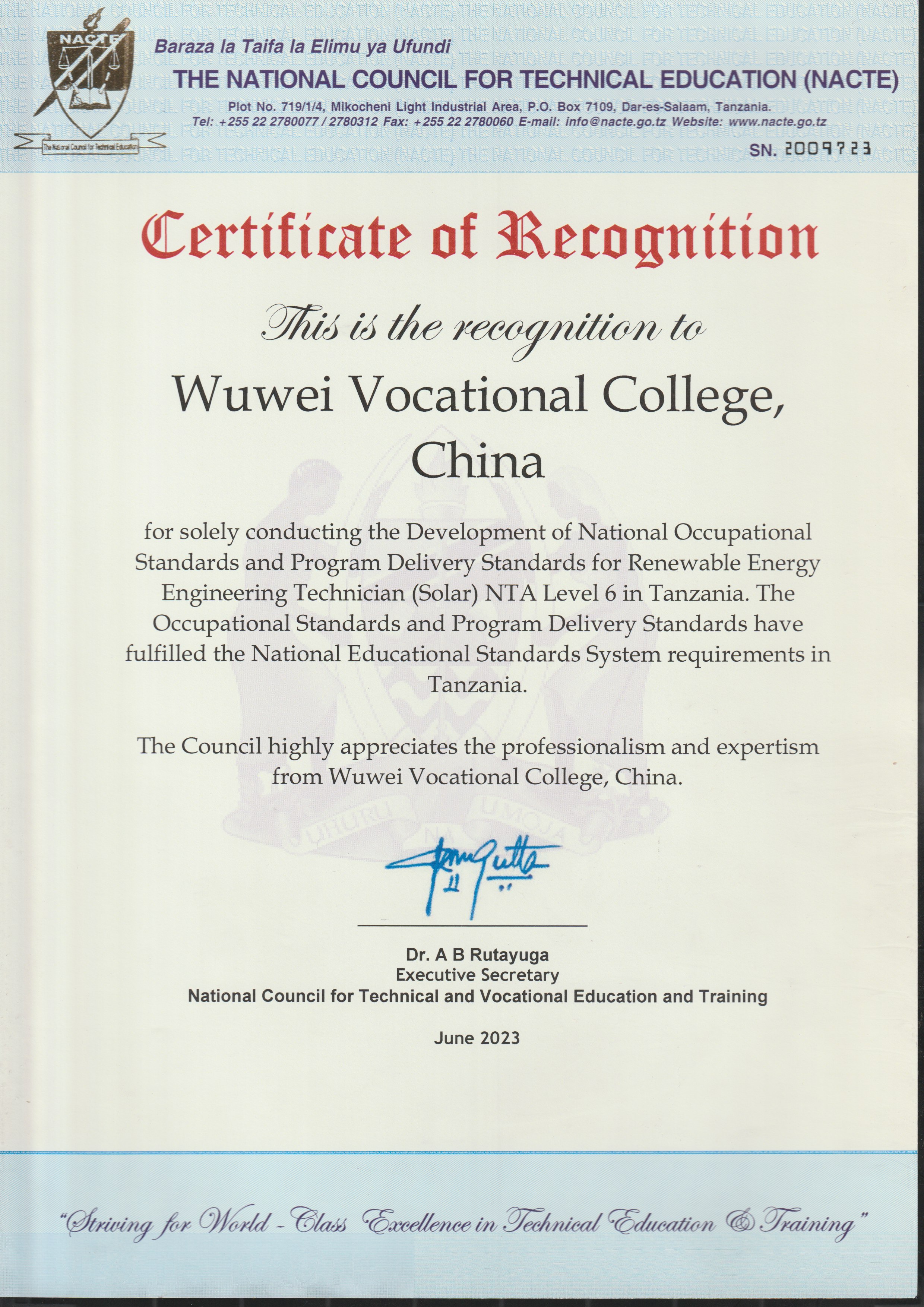 【熱烈祝賀】新能源工程技術(shù)員(太陽能)6級職業(yè)標準和配套專業(yè)教學標準通過坦桑尼亞國家職業(yè)教育委員會審核獲得認證!
