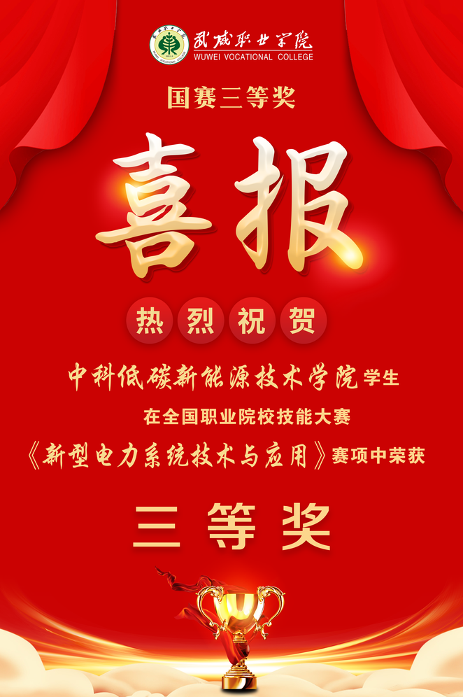 在2023年全國職業(yè)院校技能大賽中中科低碳新能源技術(shù)學(xué)院學(xué)生陳德平、徐浩芝、蘆紀(jì)維獲得高職組新型電力系統(tǒng)技術(shù)與應(yīng)用賽項(xiàng)團(tuán)體三等獎(jiǎng)。