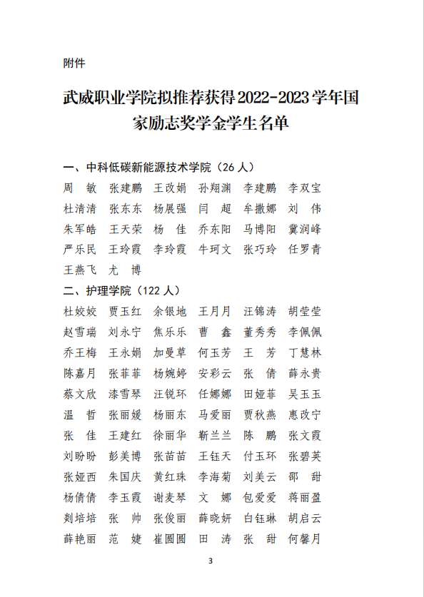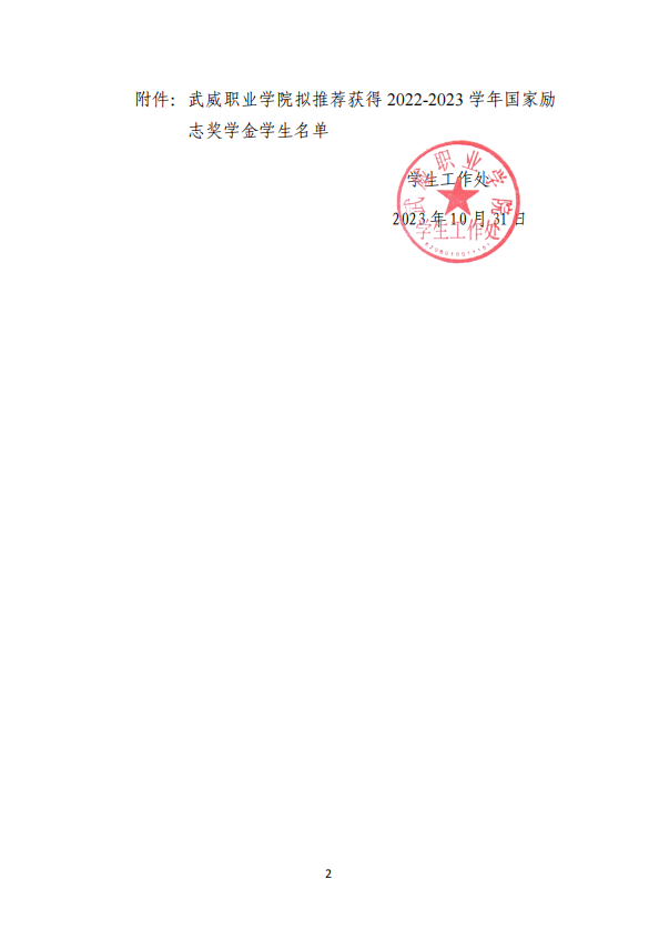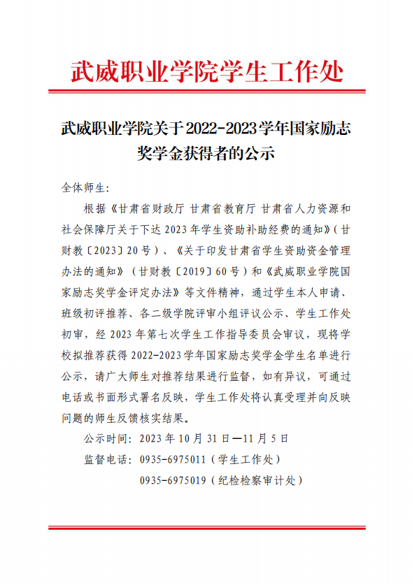 武威職業(yè)學院關(guān)于2022-2023學年國家勵志獎學金候選人的公示
