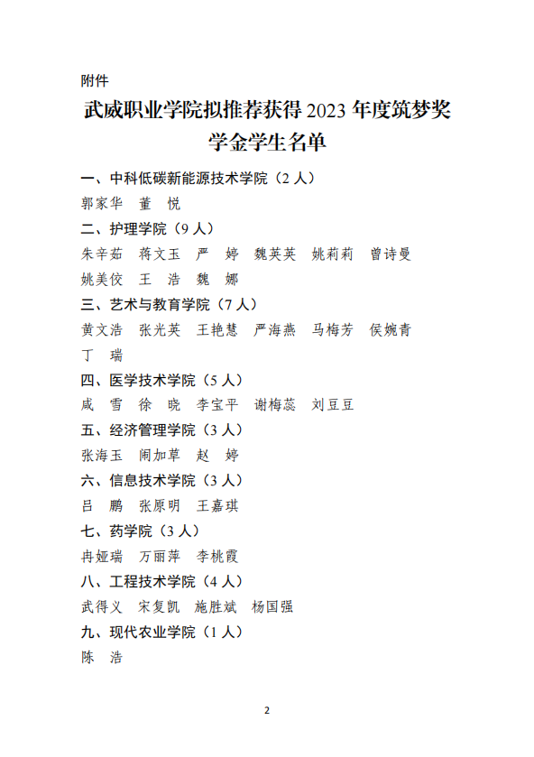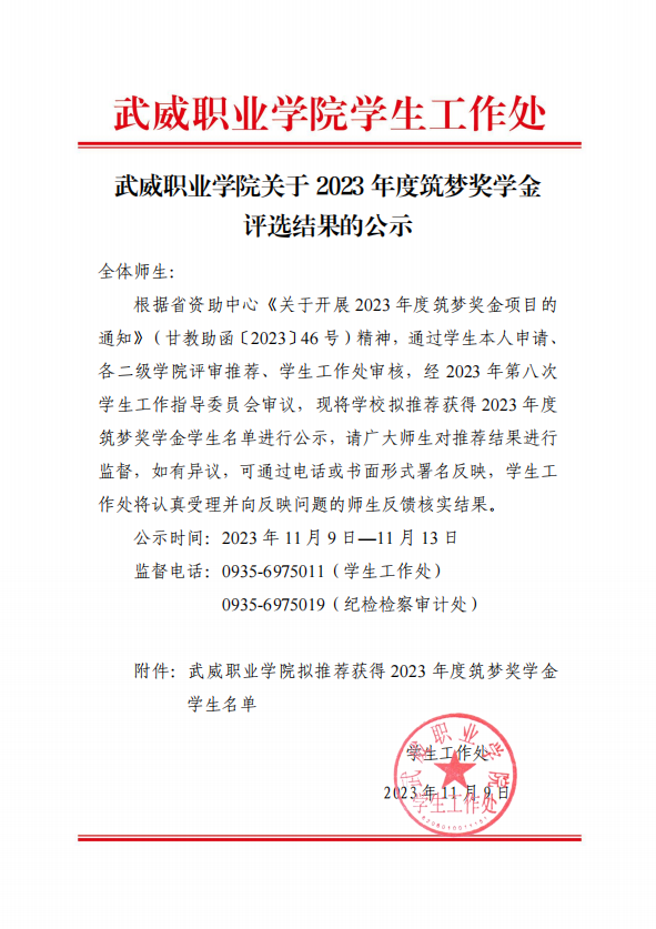 武威職業(yè)學院關于2023年度筑夢獎學金評選結果的公示