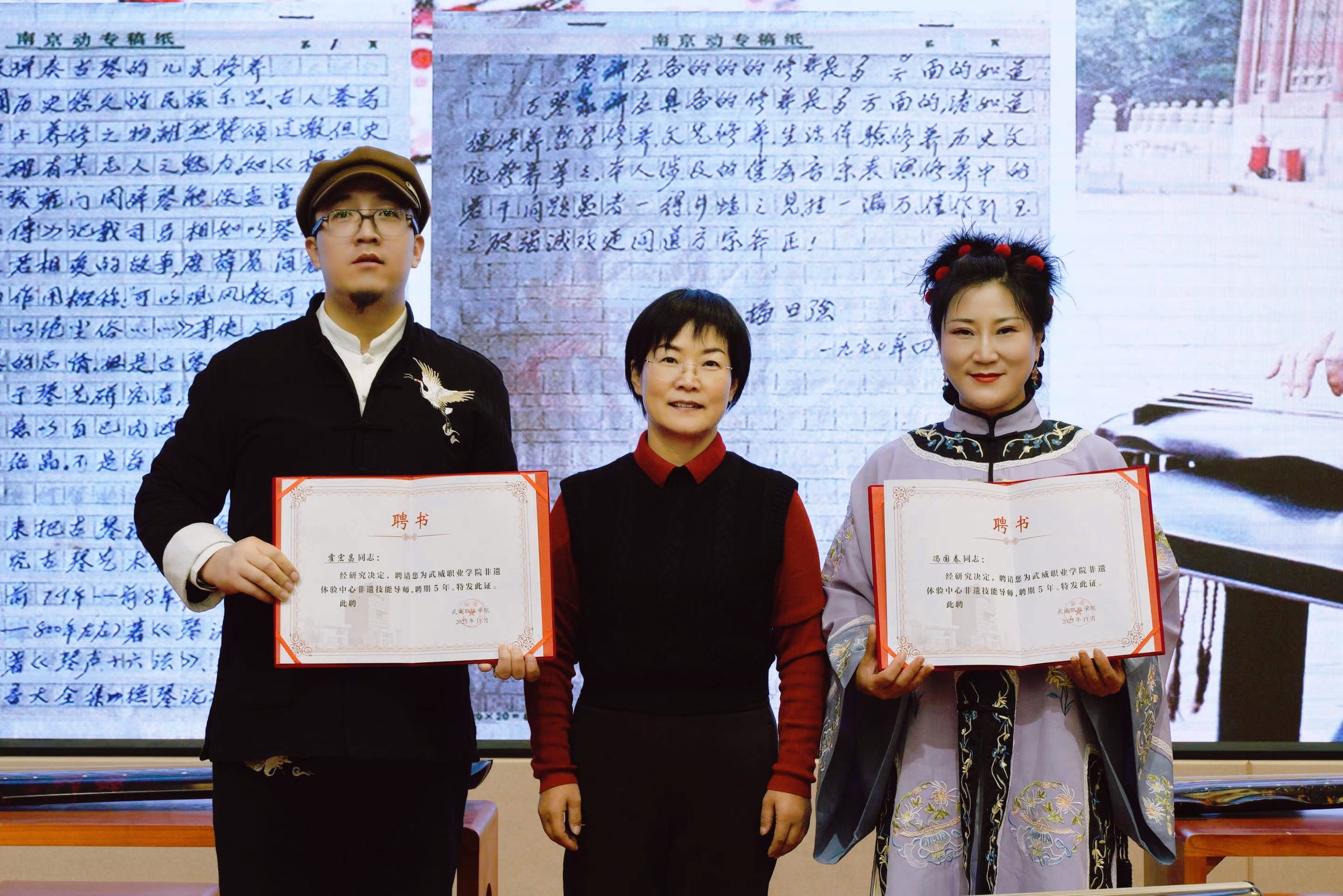 學(xué)院黨委委員、副校長(zhǎng)何毅為霍宏昌老師和馮國(guó)春老師頒發(fā)學(xué)校非遺導(dǎo)師聘書,霍宏昌老師向?qū)W院傳統(tǒng)文化體驗(yàn)中心、非遺體驗(yàn)中心贈(zèng)送古琴。中國(guó)古琴音樂(lè)是一門具有深厚歷史文化背景的藝術(shù),它以多重美的高雅品質(zhì),引人無(wú)限向往和追求。通過(guò)此次活動(dòng),旨在吸引更多的師生關(guān)注和傳承好中華優(yōu)秀傳統(tǒng)文化。